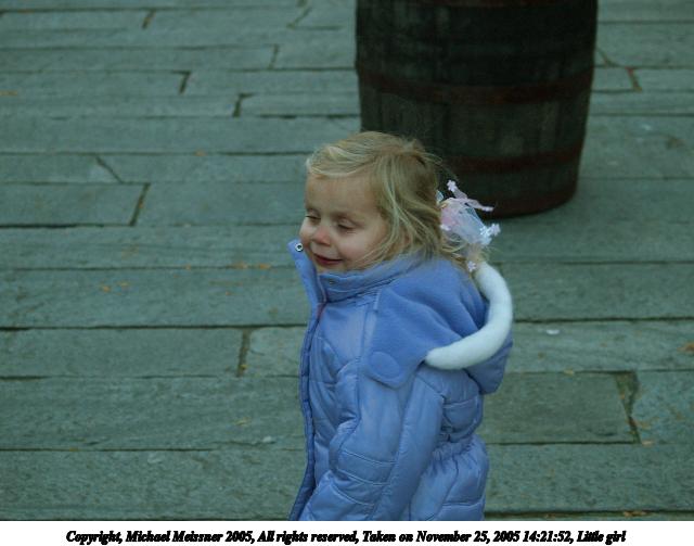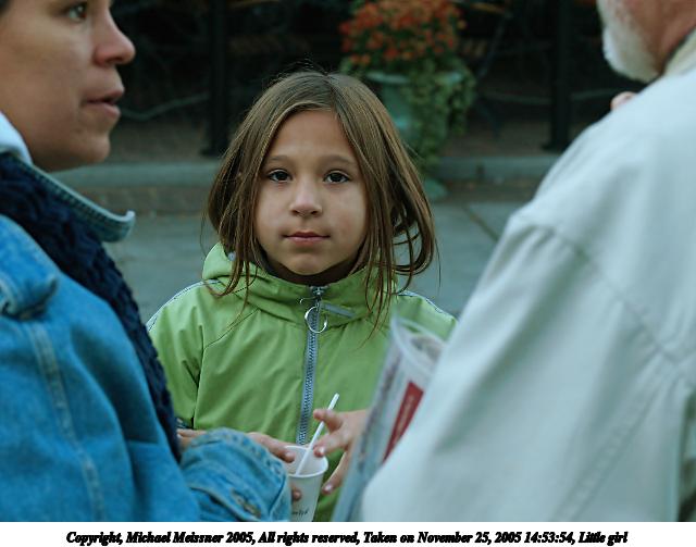 Picture #2: Little girl #2 640x503, 50,477 bytes (50K), (html file) Copyright, Michael Meissner 2005, All rights reserved Olympus E-1 camera with Olympus 50mm f/2.0 lens f/4.0, ISO 400, 1/200 sec, 50.0mm, aperture priority, SHQ, matrix metering, +2 sharpening 35mm equivalent focal length 100.0mm Taken by Michael Meissner on November 25, 2005 14:53:54 Last modified on November 25, 2005 at 18:00 |