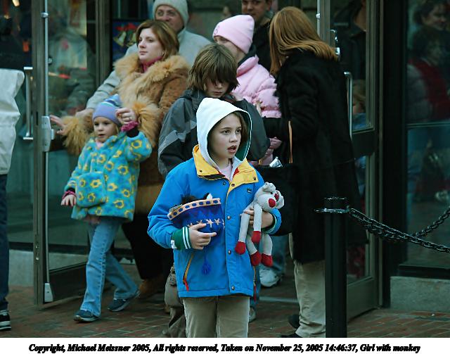 Picture #5: Girl with monkey 640x503, 68,023 bytes (67K), (html file) Copyright, Michael Meissner 2005, All rights reserved Olympus E-1 camera with Olympus 50-200mm f/2.8-3.5 lens f/4.0, ISO 400, 1/160 sec, 96.0mm, aperture priority, SHQ, matrix metering, +2 sharpening 35mm equivalent focal length 192.0mm Taken by Michael Meissner on November 25, 2005 14:46:37 Last modified on November 25, 2005 at 18:00 |