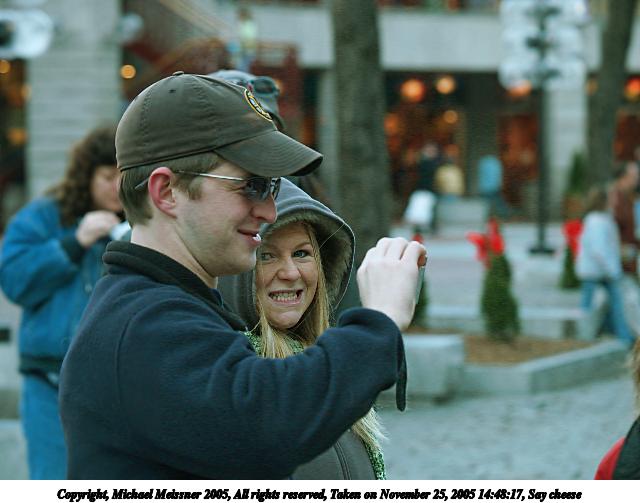 Picture #17: Say cheese 640x503, 63,991 bytes (63K), (html file) Copyright, Michael Meissner 2005, All rights reserved Olympus E-1 camera with Olympus 50-200mm f/2.8-3.5 lens f/4.0, ISO 400, 1/250 sec, 92.0mm, aperture priority, SHQ, matrix metering, +2 sharpening 35mm equivalent focal length 184.0mm Taken by Michael Meissner on November 25, 2005 14:12:26 Last modified on November 25, 2005 at 17:58 |