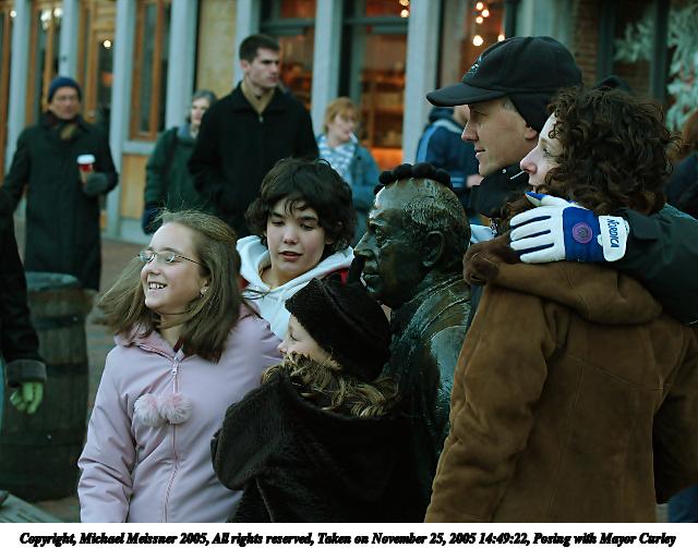 Picture #3: Posing with Mayor Curley 640x503, 63,764 bytes (63K), (html file) Copyright, Michael Meissner 2005, All rights reserved Olympus E-1 camera with Olympus 50-200mm f/2.8-3.5 lens f/4.0, ISO 400, 1/200 sec, 50.0mm, aperture priority, SHQ, matrix metering, +2 sharpening 35mm equivalent focal length 100.0mm Taken by Michael Meissner on November 25, 2005 14:49:22 Last modified on November 25, 2005 at 18:00 |