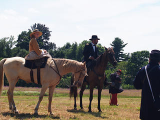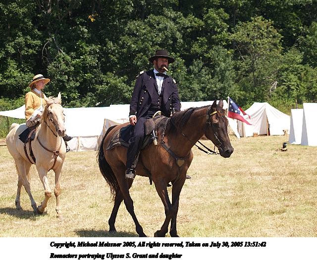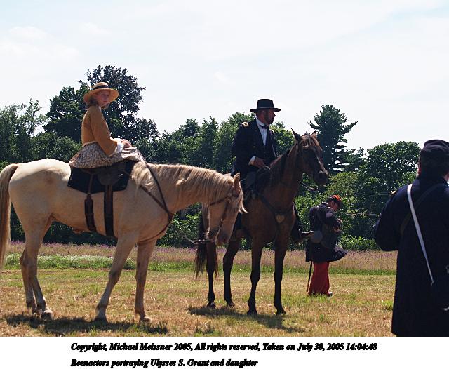 Picture #4: Reenactors portraying Ulysses S. Grant and daughter #2 Thumb: 320x240, 30,204 bytes (30K) Small: 640x526, 78,303 bytes (77K), (html file) Copyright, Michael Meissner 2005, All rights reserved Olympus E-1 camera with Sigma 55-200mm f/4.0-5.6 lens f/7.1, ISO 100, 1/400 sec, 55.0mm, auto mode, SHQ, matrix metering, +2 sharpening 35mm equivalent focal length 110.0mm Taken by Michael Meissner on July 30, 2005 14:04:48 Last modified on July 30, 2005 at 22:49 |