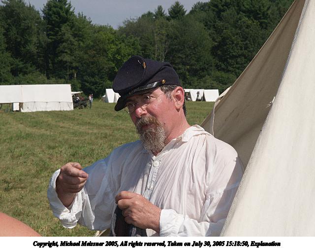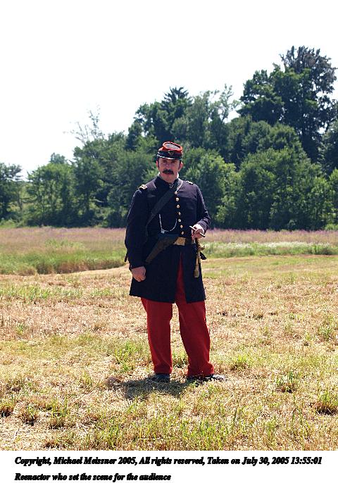 Picture #2: Reenactor who set the scene for the audience Thumb: 240x320, 35,276 bytes (35K) Small: 480x686, 102,582 bytes (101K), (html file) Copyright, Michael Meissner 2005, All rights reserved Olympus E-1 camera with Sigma 55-200mm f/4.0-5.6 lens f/5.6, ISO 100, 1/250 sec, 55.0mm, auto mode, SHQ, matrix metering, +2 sharpening 35mm equivalent focal length 110.0mm Taken by Michael Meissner on July 30, 2005 13:55:01 Last modified on July 30, 2005 at 22:48 |
