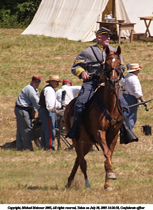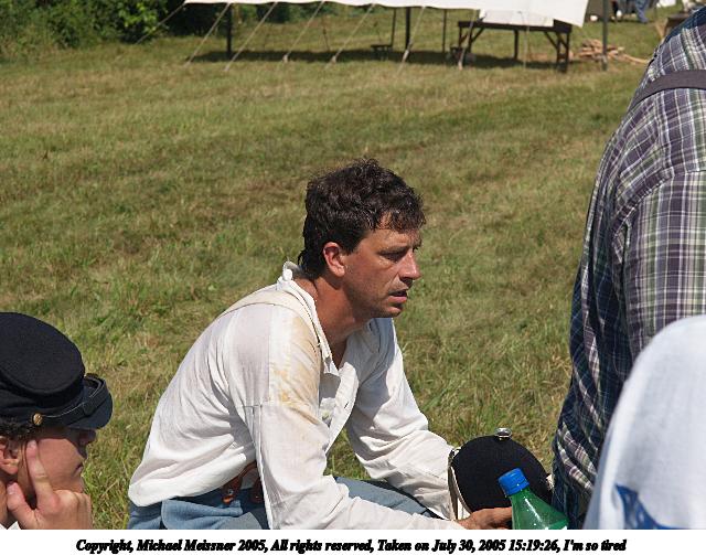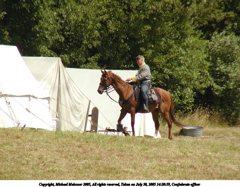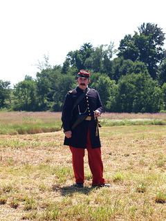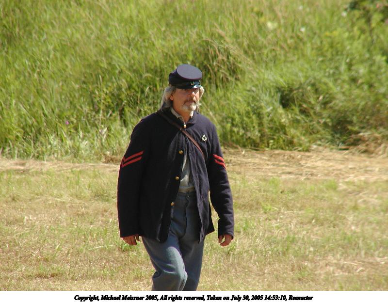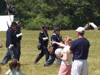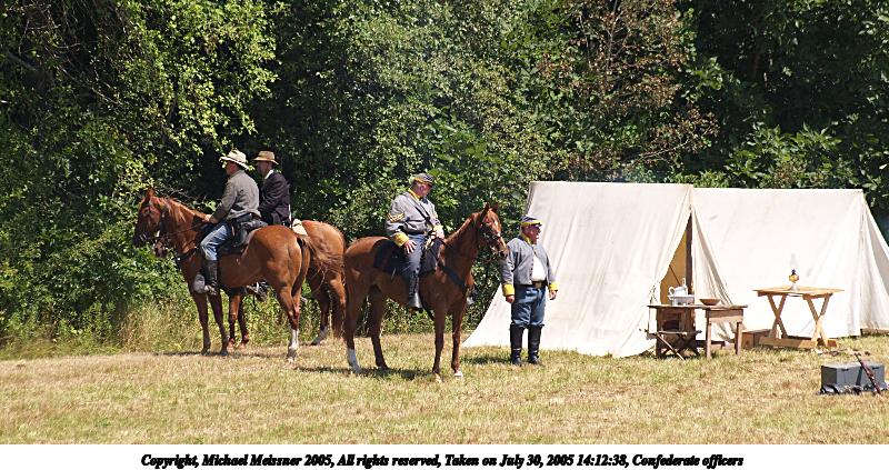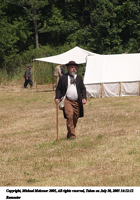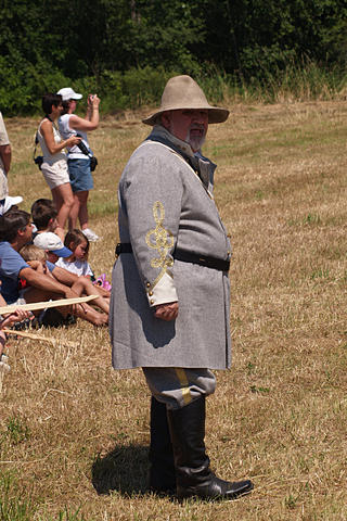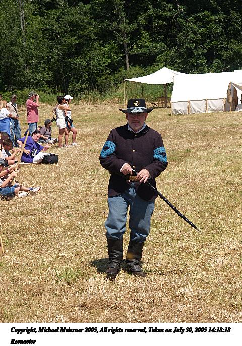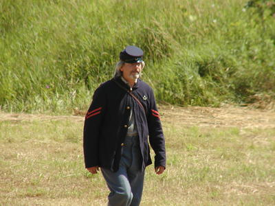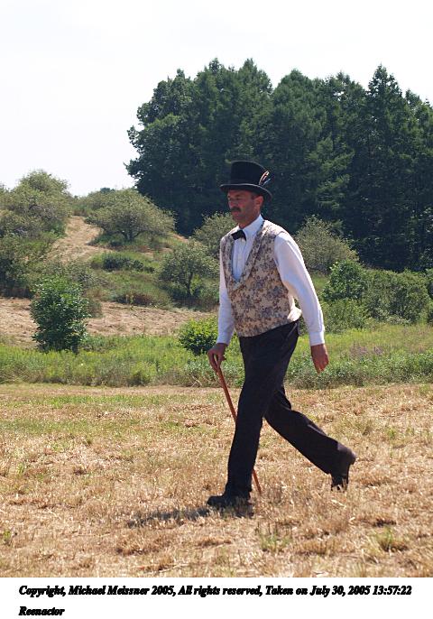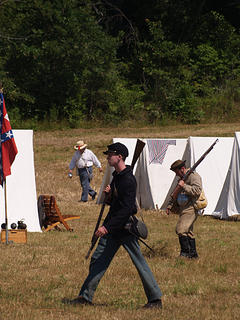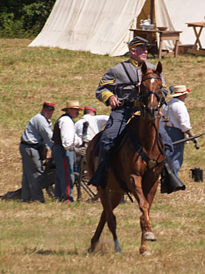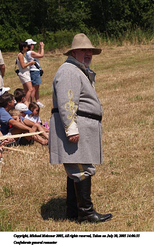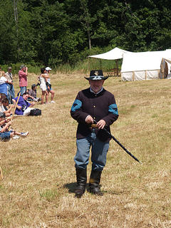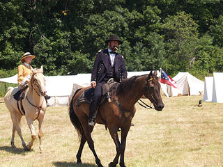 Picture #5: Confederate general reenactor Thumb: 320x480, 61,243 bytes (60K) Small: 533x846, 142,330 bytes (139K), (html file) Copyright, Michael Meissner 2005, All rights reserved Olympus E-1 camera with Sigma 55-200mm f/4.0-5.6 lens f/8.0, ISO 100, 1/500 sec, 72.0mm, auto mode, SHQ, matrix metering, +2 sharpening 35mm equivalent focal length 144.0mm Taken by Michael Meissner on July 30, 2005 14:06:35 Last modified on July 30, 2005 at 22:49 |