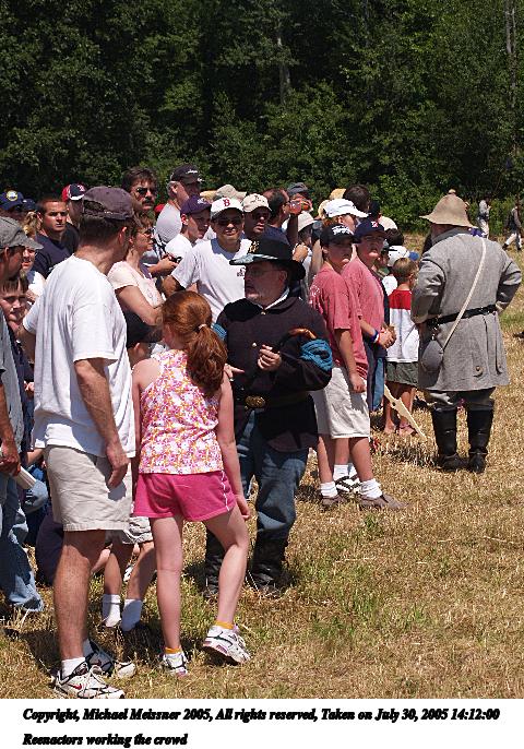 Picture #13: Reenactors working the crowd Thumb: 240x320, 40,457 bytes (40K) Small: 480x686, 121,957 bytes (120K), (html file) Copyright, Michael Meissner 2005, All rights reserved Olympus E-1 camera with Sigma 55-200mm f/4.0-5.6 lens f/7.1, ISO 100, 1/400 sec, 55.0mm, auto mode, SHQ, matrix metering, +2 sharpening 35mm equivalent focal length 110.0mm Taken by Michael Meissner on July 30, 2005 14:12:00 Last modified on July 30, 2005 at 22:49 |