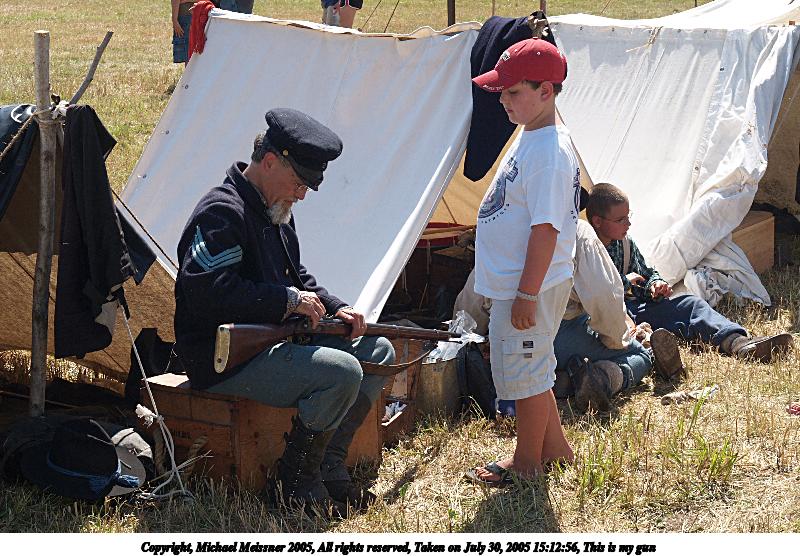 Picture #3: Reenactor Thumb: 240x320, 32,877 bytes (33K) Small: 480x686, 90,913 bytes (89K), (html file) Copyright, Michael Meissner 2005, All rights reserved Olympus E-1 camera with Sigma 55-200mm f/4.0-5.6 lens f/6.3, ISO 100, 1/320 sec, 67.0mm, auto mode, SHQ, matrix metering, +2 sharpening 35mm equivalent focal length 134.0mm Taken by Michael Meissner on July 30, 2005 13:57:22 Last modified on July 30, 2005 at 22:49 |