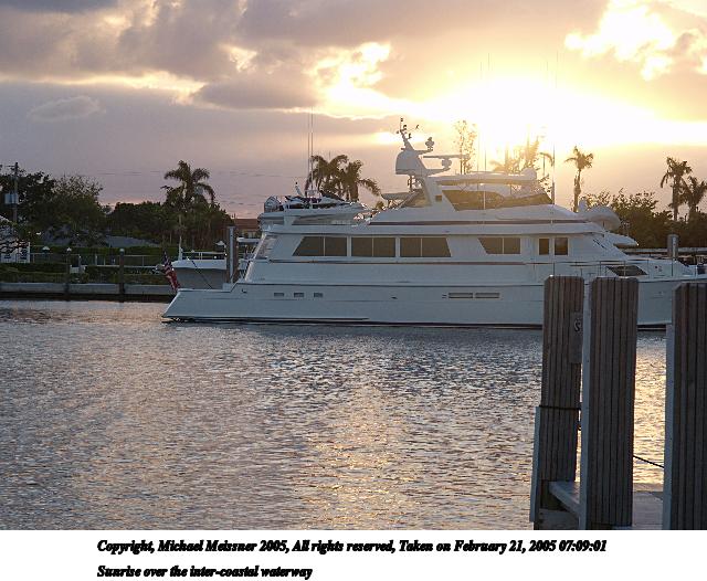 Picture #136: Sunrise over the inter-coastal waterway 640x526, 78,620 bytes (77K), (html file) Copyright, Michael Meissner 2005, All rights reserved Olympus E-1 camera with Olympus 14-54mm f/2.8-3.5 lens f/7.1, ISO 100, 1/125 sec, 54.0mm, aperture priority, SHQ, spot metering, bias -1.3, -2 contrast, +2 sharpening, manual focus, Exposure bracketing (shot 2) 35mm equivalent focal length 108.0mm Taken by Michael Meissner on February 21, 2005 07:09:01 Last modified on February 25, 2005 at 13:58 |