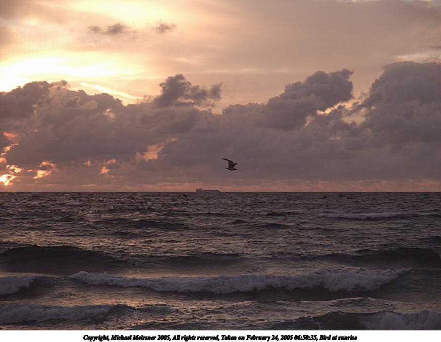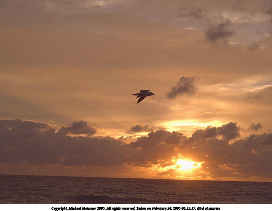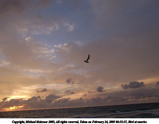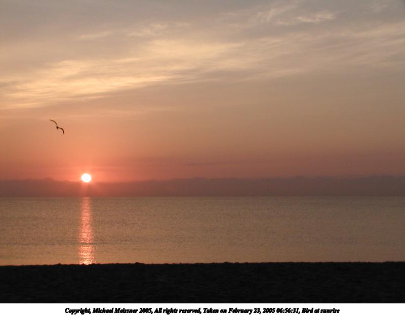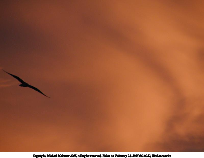 Picture #127: Bird at sunrise 800x623, 24,214 bytes (24K), (html file) Copyright, Michael Meissner 2005, All rights reserved Olympus C-2100UZ camera f/3.5, ISO 100, 1/250 sec, 70.0mm, auto mode, SHQ, matrix metering 35mm equivalent focal length 388.0mm Taken by Michael Meissner on February 22, 2005 06:44:52 Last modified on February 25, 2005 at 15:25 Shutter speed of 1/125 or 1/250 may indicate use of flash |