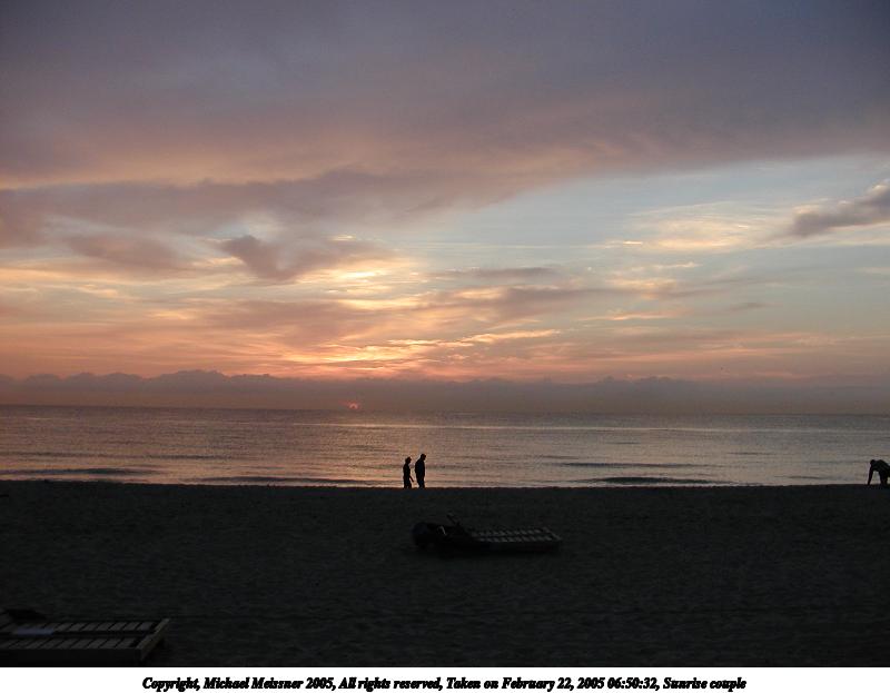 Picture #123: Sunrise couple 800x623, 44,032 bytes (43K), (html file) Copyright, Michael Meissner 2005, All rights reserved Olympus C-2100UZ camera f/2.8, ISO 100, 1/250 sec, 7.0mm, auto mode, SHQ, matrix metering 35mm equivalent focal length 39.0mm Taken by Michael Meissner on February 22, 2005 06:50:32 Last modified on February 25, 2005 at 15:32 Shutter speed of 1/125 or 1/250 may indicate use of flash |