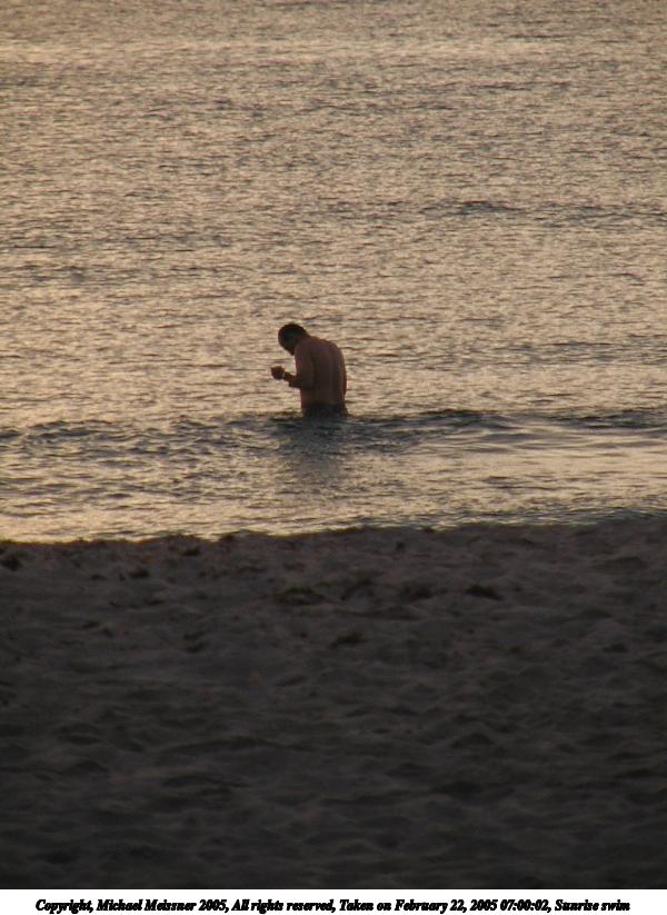 Picture #118: Sunrise swim 600x823, 82,192 bytes (81K), (html file) Copyright, Michael Meissner 2005, All rights reserved Olympus C-2100UZ camera f/3.5, ISO 100, 1/125 sec, 70.0mm, auto mode, SHQ, matrix metering 35mm equivalent focal length 388.0mm Taken by Michael Meissner on February 22, 2005 07:00:02 Last modified on February 25, 2005 at 15:44 Shutter speed of 1/125 or 1/250 may indicate use of flash |