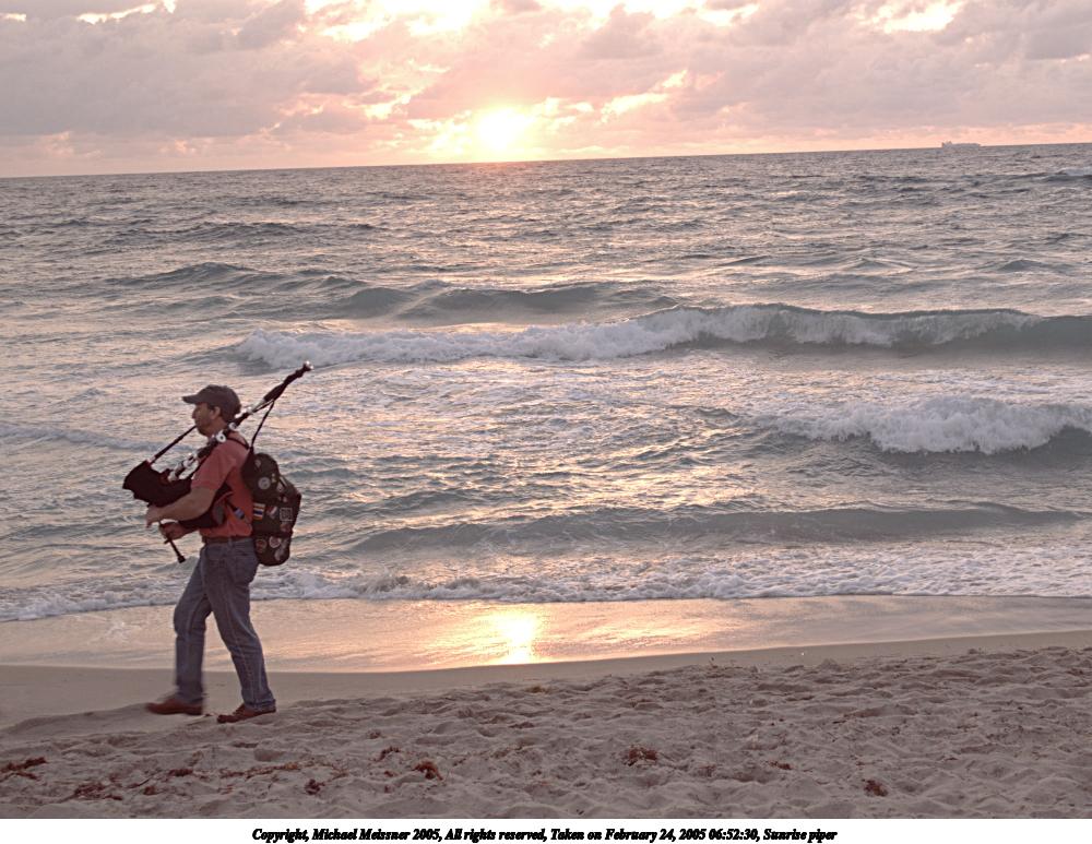 Picture #106: Sunrise piper #2 1000x773, 146,260 bytes (143K), (html file) Copyright, Michael Meissner 2005, All rights reserved Olympus E-1 camera with Olympus 14-54mm f/2.8-3.5 lens f/3.2, ISO 100, 1/60 sec, 25.0mm, auto mode, SHQ, spot metering, -2 contrast, +2 sharpening, auto + manual focus, Exposure bracketing (shot 1) 35mm equivalent focal length 50.0mm Taken by Michael Meissner on February 24, 2005 06:52:30 Last modified on February 26, 2005 at 08:47 Converted from RAW file. |
