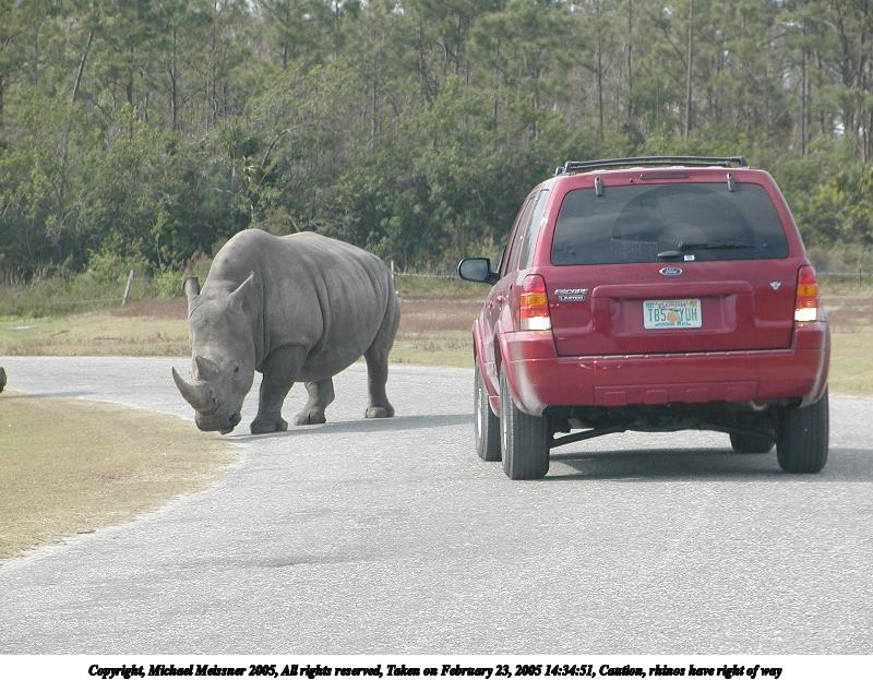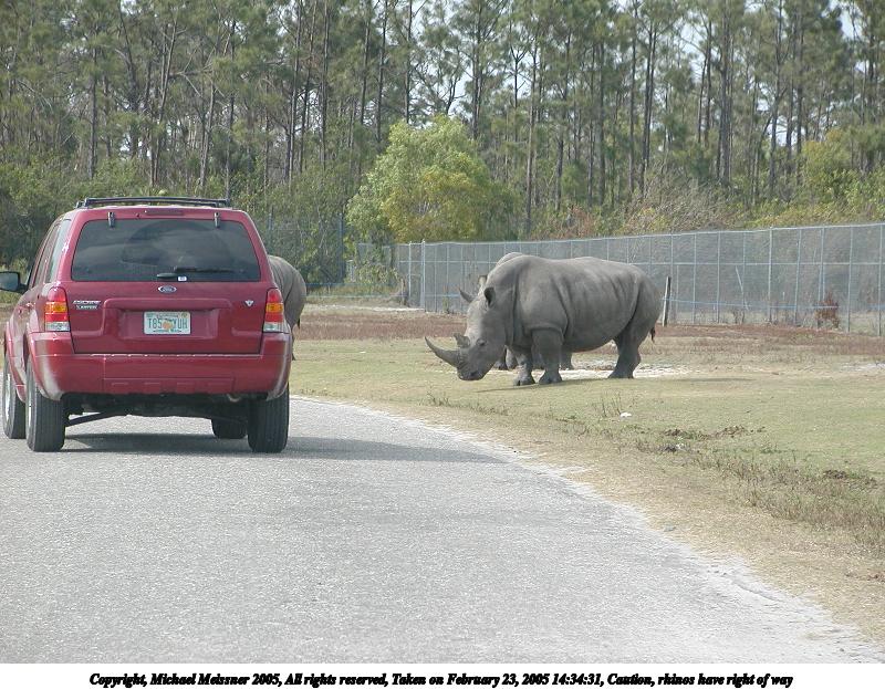 Picture #49: Caution, rhinos have right of way 800x623, 124,276 bytes (122K), (html file) Copyright, Michael Meissner 2005, All rights reserved Olympus C-2100UZ camera f/3.5, ISO 100, 1/800 sec, 32.5mm, auto mode, SHQ, matrix metering 35mm equivalent focal length 180.0mm Extra equipment used: Polarizer, shot through car window Taken by Michael Meissner on February 23, 2005 14:34:31 Last modified on July 21, 2005 at 15:17 |