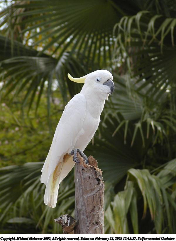 Picture #39: Sulfur-creasted Cockatoo 600x823, 67,288 bytes (66K), (html file) Copyright, Michael Meissner 2005, All rights reserved Olympus C-2100UZ camera f/3.5, ISO 100, 1/650 sec, 32.5mm, auto mode, SHQ, matrix metering 35mm equivalent focal length 180.0mm Extra equipment used: Polarizer Taken by Michael Meissner on February 23, 2005 15:13:37 Last modified on July 21, 2005 at 15:19 |