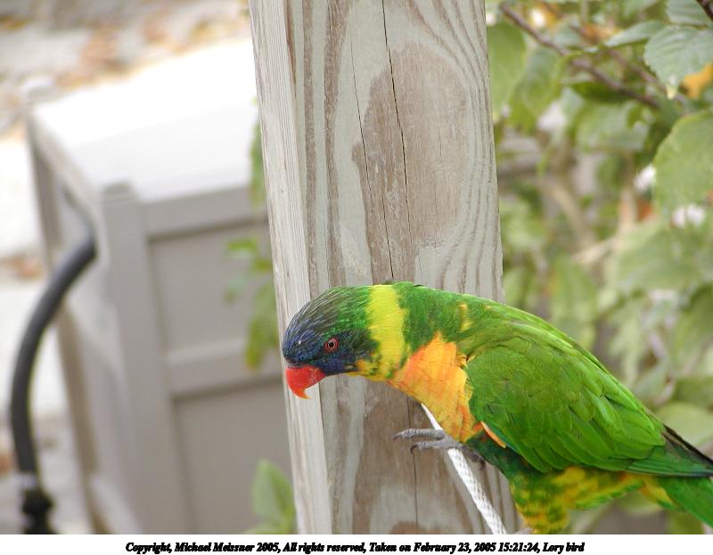 Picture #32: Lory bird 600x823, 164,137 bytes (161K), (html file) Copyright, Michael Meissner 2005, All rights reserved Olympus C-2100UZ camera f/2.8, ISO 100, 1/500 sec, 34.1mm, auto mode, SHQ, matrix metering 35mm equivalent focal length 189.0mm Extra equipment used: Polarizer Taken by Michael Meissner on February 23, 2005 15:21:07 Last modified on July 21, 2005 at 15:21 |
