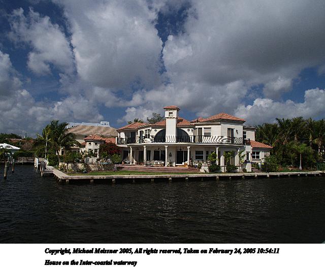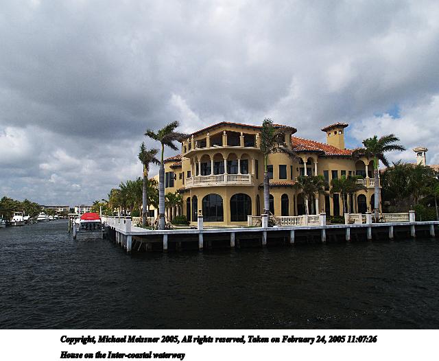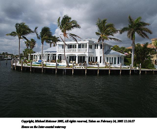 Picture #15: House on the Inter-coastal waterway 640x526, 71,083 bytes (70K), (html file) Copyright, Michael Meissner 2005, All rights reserved Olympus E-1 camera with Olympus 14-54mm f/2.8-3.5 lens f/7.1, ISO 100, 1/250 sec, 14.0mm, shutter priority, SHQ, matrix metering, -2 contrast, +2 sharpening, auto + manual focus, auto focus left 35mm equivalent focal length 28.0mm Extra equipment used: Polarizer Taken by Michael Meissner on February 24, 2005 10:54:11 Last modified on July 21, 2005 at 15:25 |