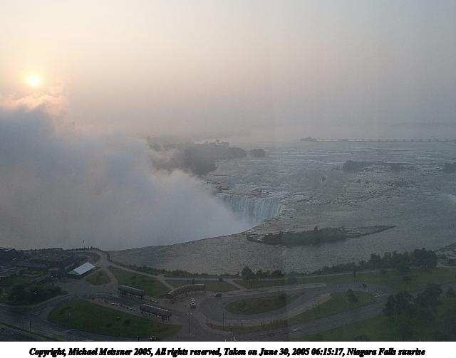 Picture #78: Niagara Falls sunrise 640x503, 38,246 bytes (38K), (html file) Copyright, Michael Meissner 2005, All rights reserved Olympus E-1 camera with Olympus 14-54mm f/2.8-3.5 lens f/5.0, ISO 100, 1/125 sec, 17.0mm, auto mode, SHQ, spot metering, -2 contrast, +2 sharpening 35mm equivalent focal length 34.0mm Taken by Michael Meissner on June 30, 2005 06:15:17 Last modified on July 06, 2005 at 09:25 Shot through the window of our hotel room. |