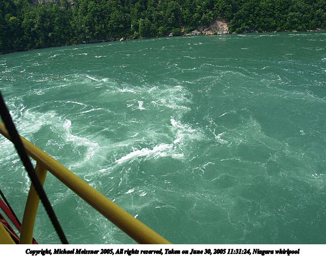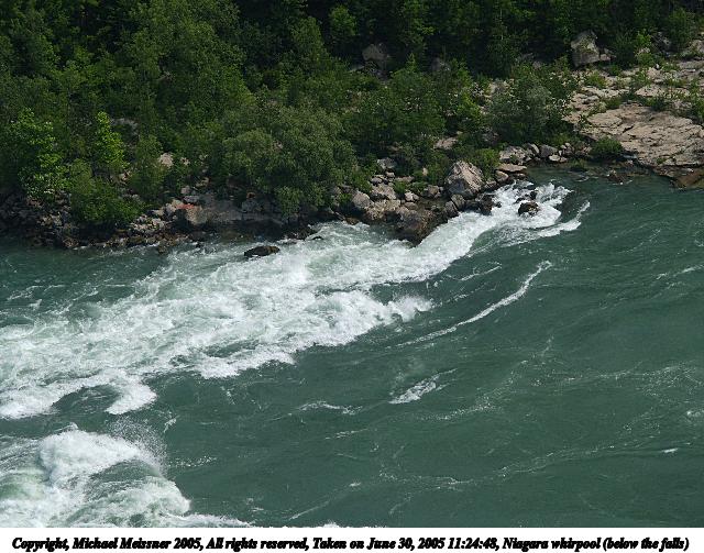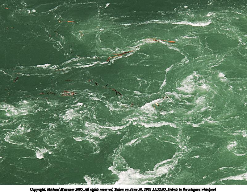 Picture #69: Debris in the niagara whirlpool 800x623, 129,479 bytes (127K), (html file) Copyright, Michael Meissner 2005, All rights reserved Olympus E-1 camera with Olympus 14-54mm f/2.8-3.5 lens f/5.0, ISO 100, 1/250 sec, 54.0mm, auto mode, SHQ, matrix metering, -2 contrast, +2 sharpening 35mm equivalent focal length 108.0mm Taken by Michael Meissner on June 30, 2005 11:32:03 Last modified on July 06, 2005 at 20:02 When the Canadian and American towns of Niagara Falls lower the level of the falls at night (diverting the water to generate electricity), the whirlpool reverses directions, and it flushes out most of the debris that accumulates through the day. |
