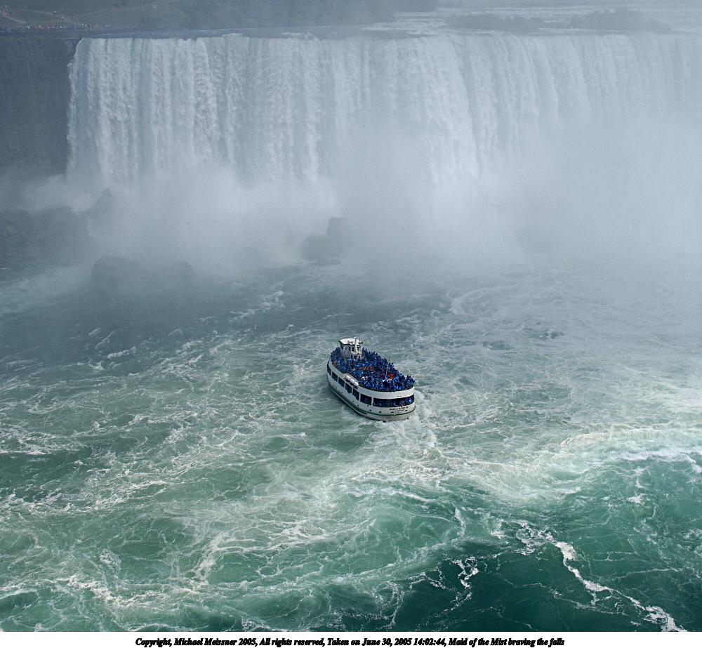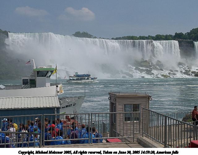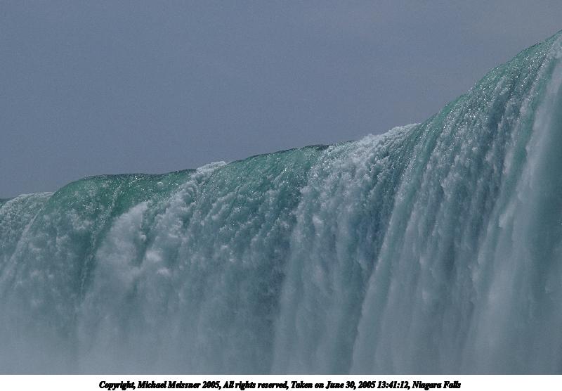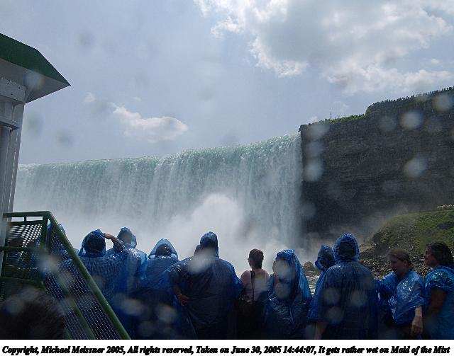 Picture #39: It gets rather wet on Maid of the Mist 640x503, 55,184 bytes (54K), (html file) Copyright, Michael Meissner 2005, All rights reserved Olympus E-1 camera with Olympus 14-54mm f/2.8-3.5 lens f/10.0, ISO 100, 1/320 sec, 14.0mm, auto mode, SHQ, matrix metering, -2 contrast, +2 sharpening 35mm equivalent focal length 28.0mm Taken by Michael Meissner on June 30, 2005 14:44:07 Last modified on June 30, 2005 at 16:46 It was nice to have a camera (E-1 + 14-54mm lens) designed to be splash-proof to take shots like these from the Maid of the Mist boat ride. |
