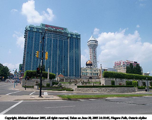 Picture #50: Niagara Falls, Ontario skyline #2 640x503, 77,540 bytes (76K), (html file) Copyright, Michael Meissner 2005, All rights reserved Olympus E-1 camera with Olympus 14-54mm f/2.8-3.5 lens f/8.0, ISO 100, 1/320 sec, 14.0mm, auto mode, SHQ, matrix metering, -2 contrast, +2 sharpening 35mm equivalent focal length 28.0mm Taken by Michael Meissner on June 30, 2005 14:18:05 Last modified on June 30, 2005 at 16:45 |