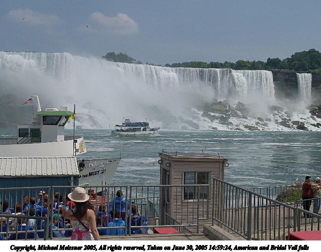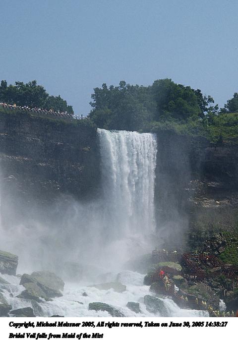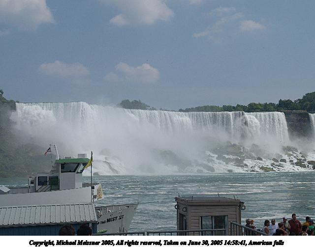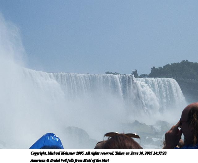 Picture #47: American & Bridal Veil falls from Maid of the Mist #2 640x526, 39,475 bytes (39K), (html file) Copyright, Michael Meissner 2005, All rights reserved Olympus E-1 camera with Olympus 14-54mm f/2.8-3.5 lens f/9.0, ISO 100, 1/400 sec, 40.0mm, auto mode, SHQ, matrix metering, -2 contrast, +2 sharpening 35mm equivalent focal length 80.0mm Taken by Michael Meissner on June 30, 2005 14:37:50 Last modified on June 30, 2005 at 16:45 |