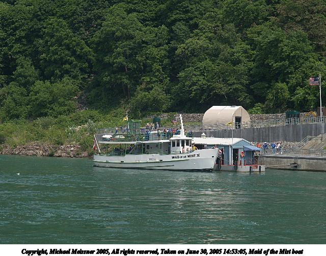 Picture #37: Maid of the Mist boat 640x503, 98,251 bytes (96K), (html file) Copyright, Michael Meissner 2005, All rights reserved Olympus E-1 camera with Olympus 14-54mm f/2.8-3.5 lens f/7.1, ISO 100, 1/320 sec, 54.0mm, auto mode, SHQ, matrix metering, -2 contrast, +2 sharpening 35mm equivalent focal length 108.0mm Taken by Michael Meissner on June 30, 2005 14:53:05 Last modified on June 30, 2005 at 16:46 |