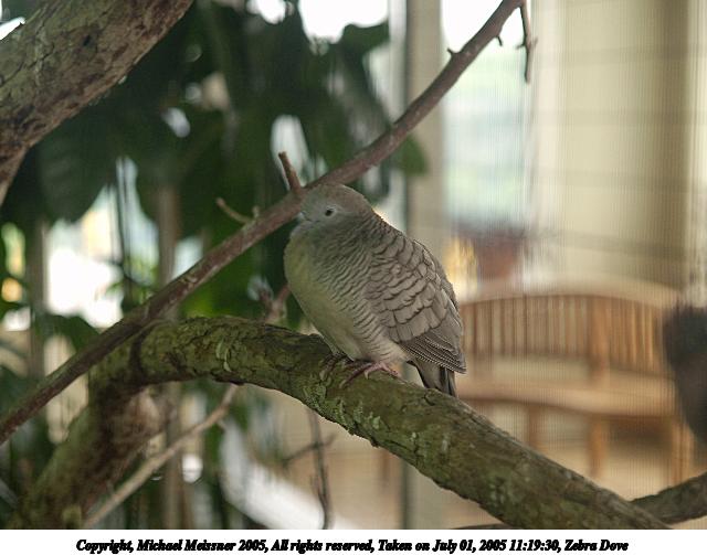 Picture #31: Zebra Dove 640x503, 54,266 bytes (53K), (html file) Copyright, Michael Meissner 2005, All rights reserved Olympus E-1 camera with Olympus 14-54mm f/2.8-3.5 lens f/3.5, ISO 100, 1/50 sec, 52.0mm, auto mode, SHQ, matrix metering, -2 contrast, +2 sharpening 35mm equivalent focal length 104.0mm Extra equipment used: shot through cage wires Taken by Michael Meissner on July 01, 2005 11:19:30 Last modified on July 08, 2005 at 22:05 |