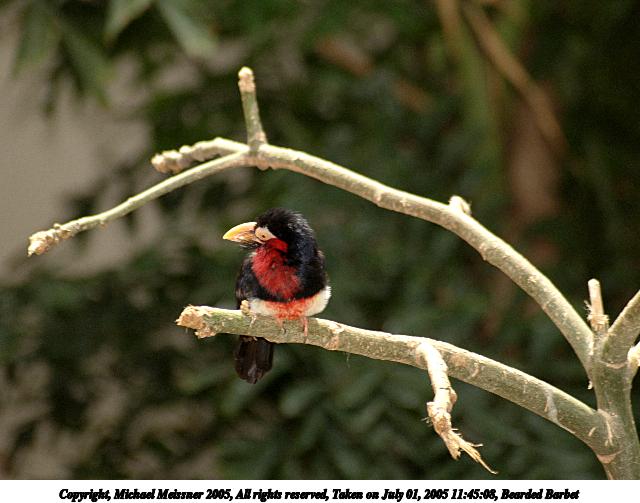 Picture #21: Bearded Barbet 640x503, 55,954 bytes (55K), (html file) Copyright, Michael Meissner 2005, All rights reserved Olympus E-1 camera with Sigma 55-200mm f/4.0-5.6 lens f/5.6, ISO 100, ext. flash, 1/160 sec, 200.0mm, auto mode, SHQ, matrix metering, -2 contrast, +2 sharpening 35mm equivalent focal length 401.0mm Extra equipment used: Promaster 5750DX flash Taken by Michael Meissner on July 01, 2005 11:45:08 Last modified on July 09, 2005 at 17:19 |