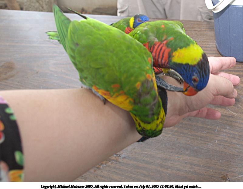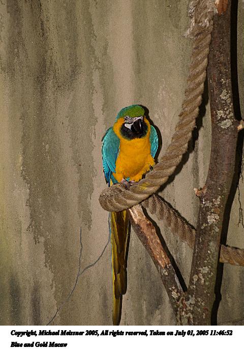Picture #19: Blue and Gold Macaw 480x686, 83,444 bytes (82K), (html file) Copyright, Michael Meissner 2005, All rights reserved Olympus E-1 camera with Sigma 55-200mm f/4.0-5.6 lens f/4.9, ISO 100, ext. flash, 1/160 sec, 122.0mm, auto mode, SHQ, matrix metering, -2 contrast, +2 sharpening 35mm equivalent focal length 244.0mm Extra equipment used: Promaster 5750DX flash Taken by Michael Meissner on July 01, 2005 11:46:52 Last modified on July 09, 2005 at 19:55 I feel he is saying "Welcome aboard maties...". |