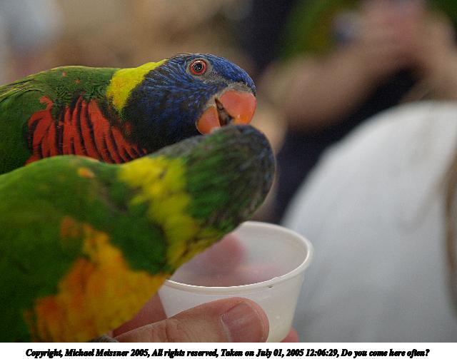 Picture #4: Lory bird feeding 640x503, 53,307 bytes (53K), (html file) Copyright, Michael Meissner 2005, All rights reserved Olympus E-1 camera with Olympus 14-54mm f/2.8-3.5 lens f/3.5, ISO 100, ext. flash, 1/100 sec, 52.0mm, auto mode, SHQ, matrix metering, -2 contrast, +2 sharpening 35mm equivalent focal length 104.0mm Extra equipment used: Promaster 5750DX flash Taken by Michael Meissner on July 01, 2005 12:05:57 Last modified on July 10, 2005 at 10:42 |