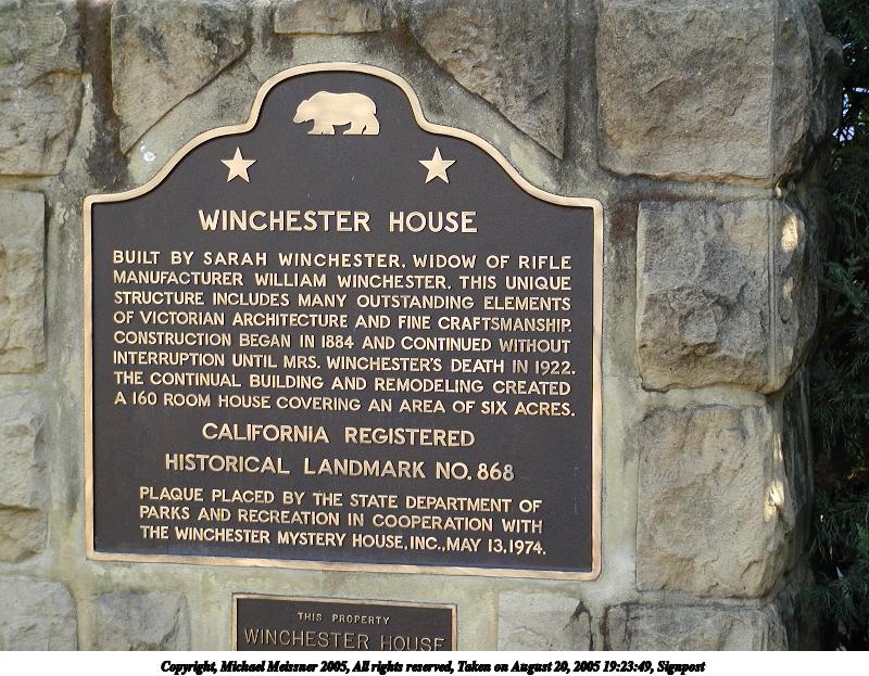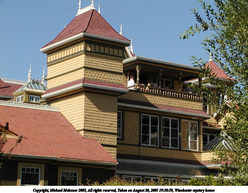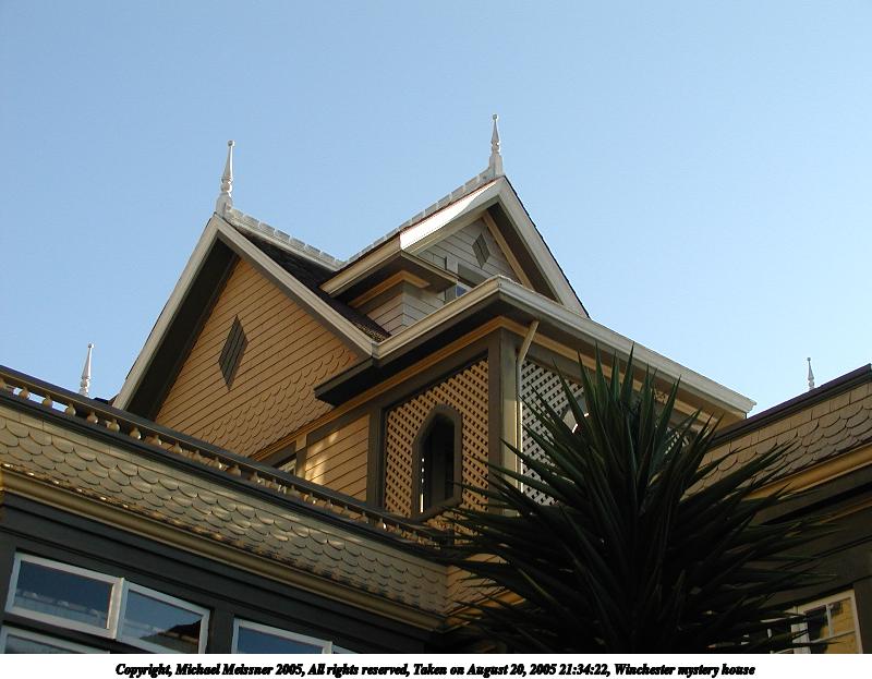 Picture #8: Winchester mystery house #3 800x623, 92,303 bytes (91K), (html file) Copyright, Michael Meissner 2005, All rights reserved Olympus C-2100UZ camera f/2.8, ISO 100, 1/250 sec, 7.0mm, auto mode, SHQ, cloudy, matrix metering 35mm equivalent focal length 39.0mm Taken by Michael Meissner on August 20, 2005 21:29:23 Last modified on August 27, 2005 at 13:02 Shutter speed of 1/125 or 1/250 may indicate use of flash |