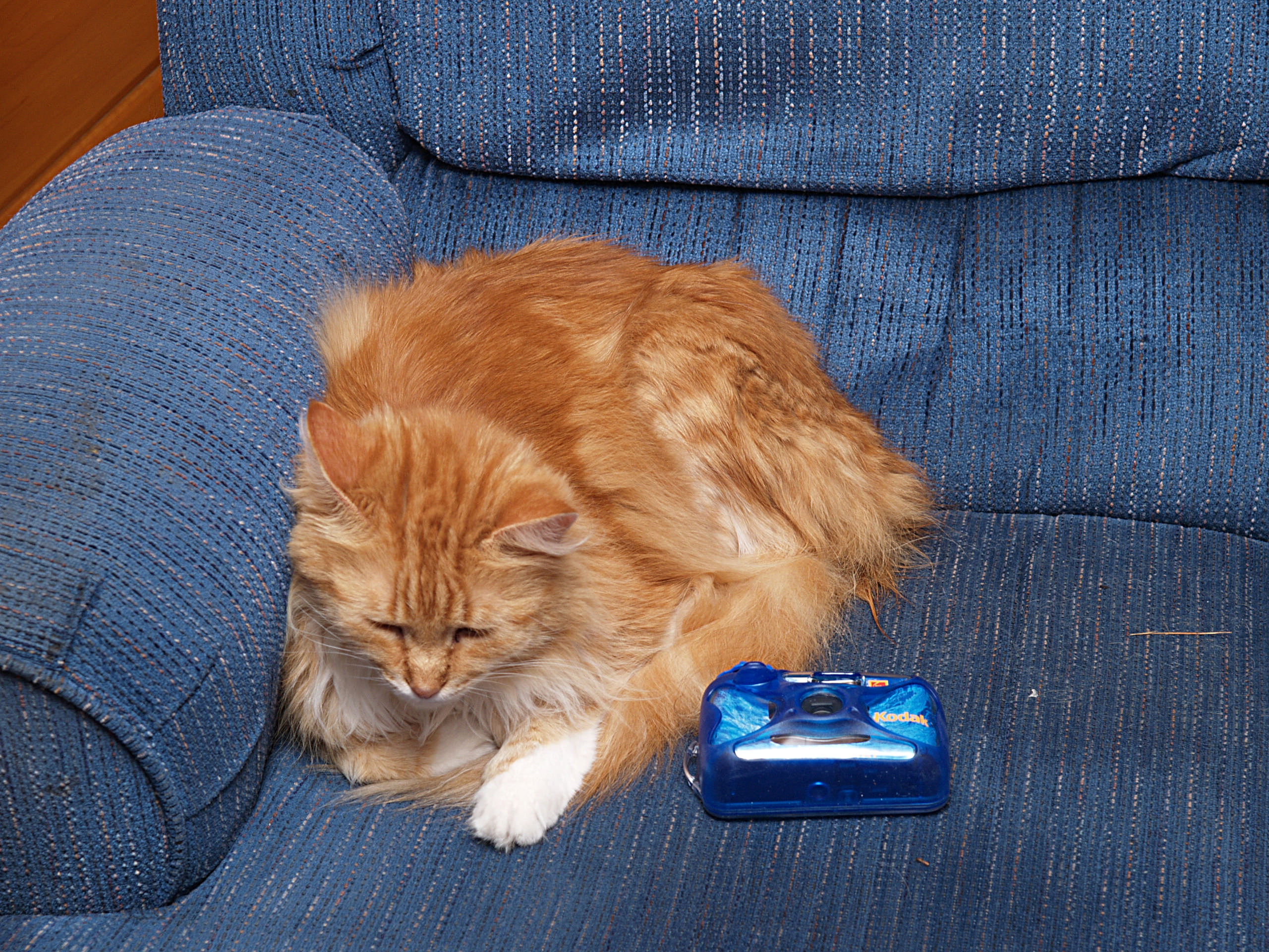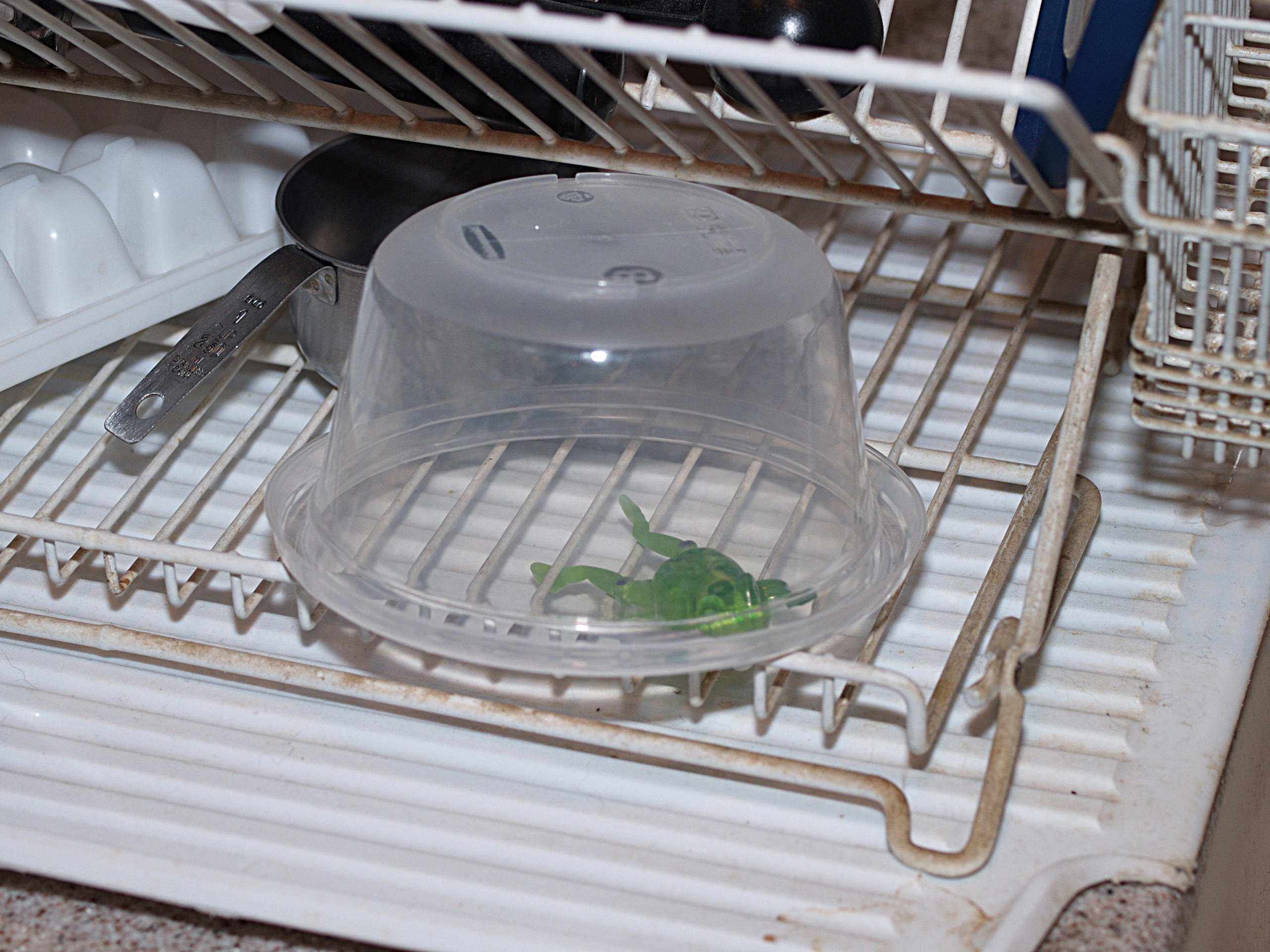 Picture #64: Trapped frog Small: 640x503, 67,561 bytes (66K), (html file) Large: 2560x1920, 2,149,963 bytes (2.1M), (html file) Copyright, Michael Meissner 2006, All rights reserved Olympus E-1 camera with Olympus 50mm f/2.0 lens f/4.0, ISO 100, FL-50 flash, 1/100 sec, 50.0mm, aperture priority, SHQ, matrix metering, +2 sharpening 35mm equivalent focal length 100.0mm Extra equipment used: FL-50 flash Taken by Michael Meissner on May 16, 2006 08:10:31 Last modified on May 16, 2006 at 08:13 Now my wife and daughter claim that it was pure accident that the plastic bowl was placed on top of the wind-up frog, trapping him. However, I suspect it may have been the cats, since they like to play with their food :-) |