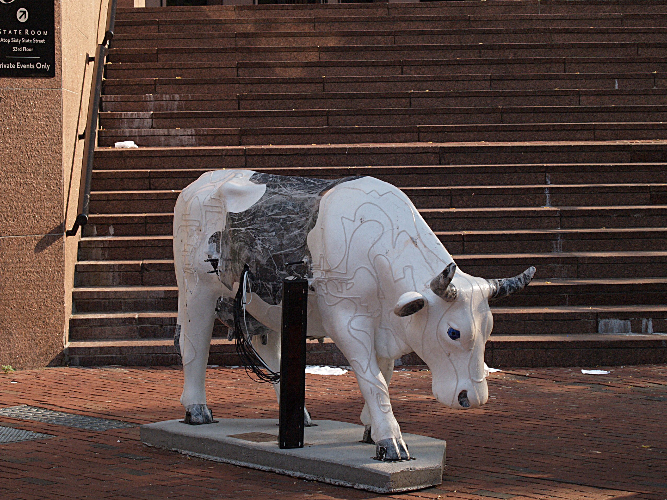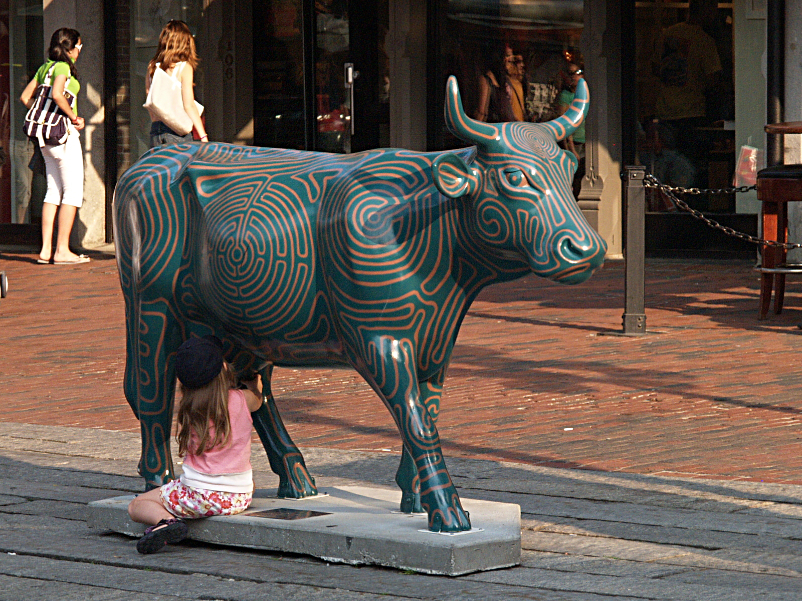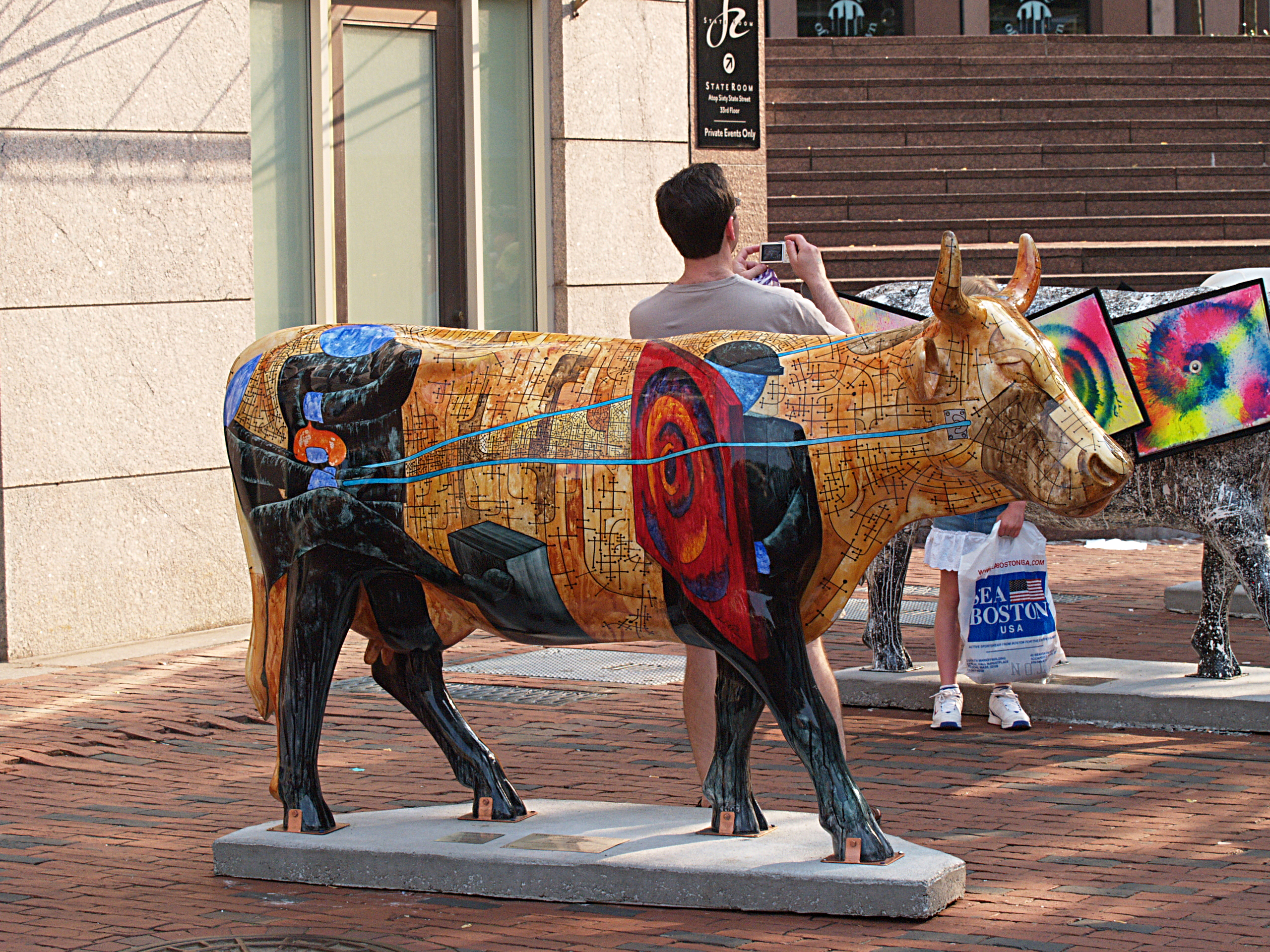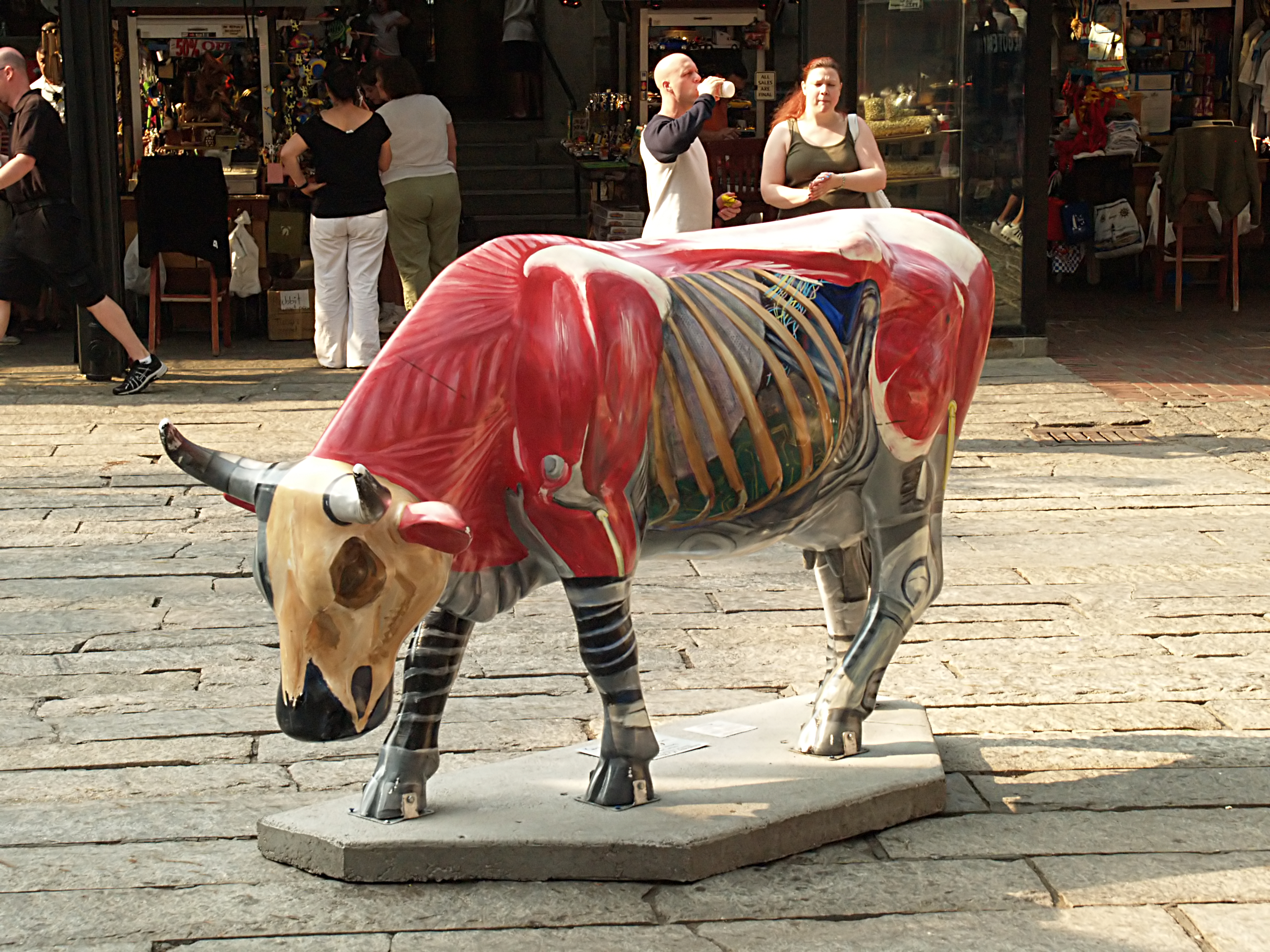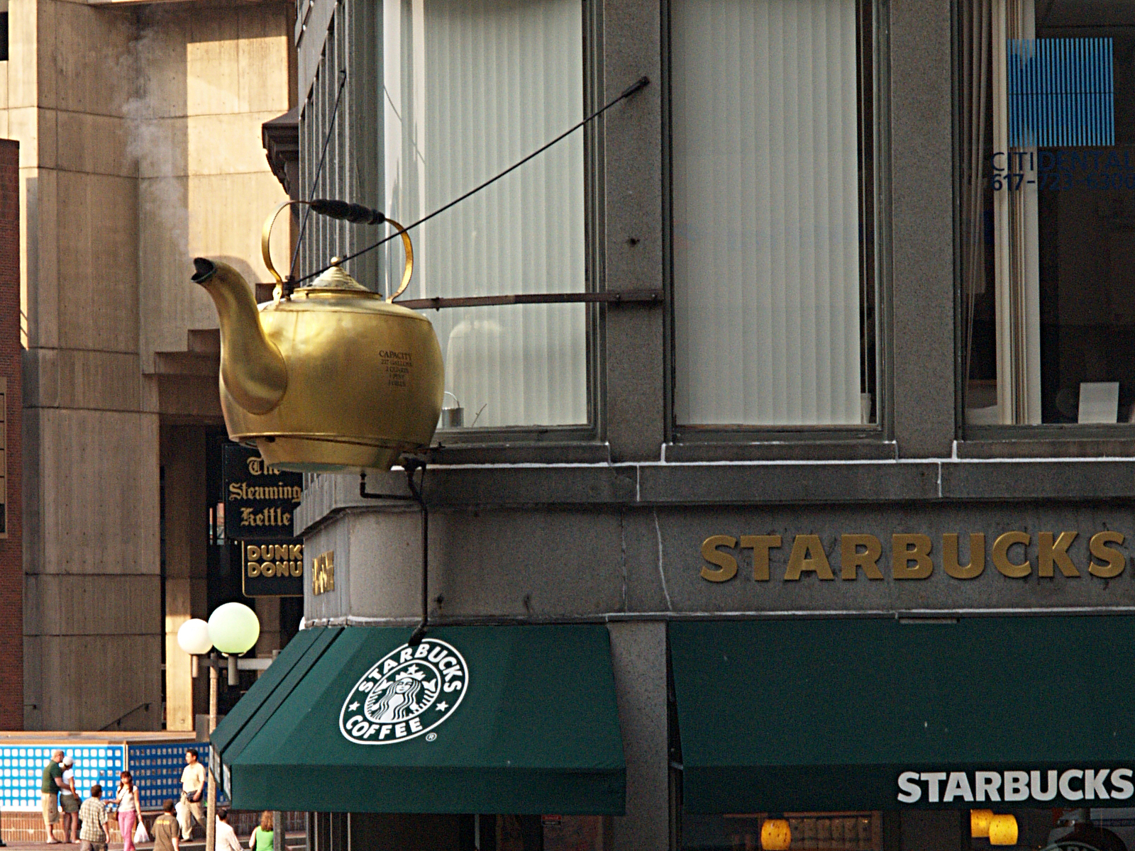 Picture #7: Old and new Small: 800x623, 99,998 bytes (98K), (html file) Large: 1600x1200, 2,427,078 bytes (2.3M), (html file) Copyright, Michael Meissner 2006, All rights reserved Olympus E-1 camera with Olympus 14-54mm f/2.8-3.5 lens f/5.6, ISO 400, 1/320 sec, 54.0mm, auto mode, SHQ, matrix metering, +2 sharpening 35mm equivalent focal length 108.0mm Taken by Michael Meissner on July 08, 2006 18:13:39 Last modified on July 08, 2006 at 20:30 For some reason, I am always fascinated by the old and new of this shot. The 227 gallon tea kettle was a Boston landmark for many years and it was cast in 1873. The shop that used it went out of business, and eventually Starbucks located in the spot and resurrected the old symbol. |