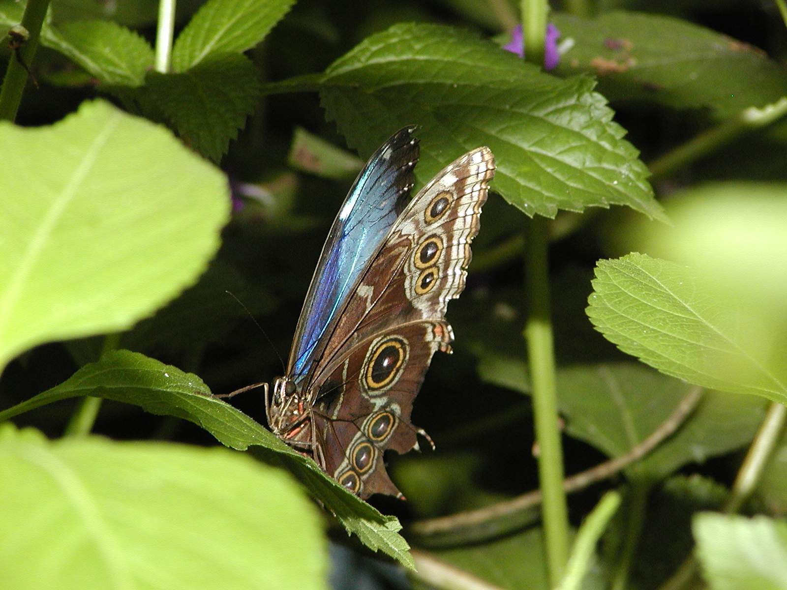 Picture #16: Blue morpho butterfly #2 Small: 800x623, 73,235 bytes (72K), (html file) Large: 1600x1200, 1,188,062 bytes (1.1M), (html file) Copyright, Michael Meissner 2006, All rights reserved Olympus C-2100UZ camera f/4.0, ISO 200, 1/250 sec, 41.3mm, manual mode, SHQ, cloudy, matrix metering, macro 35mm equivalent focal length 229.0mm Taken by Michael Meissner on July 22, 2006 11:30:57 Last modified on July 22, 2006 at 16:30 Shutter speed of 1/125 or 1/250 may indicate use of flash |