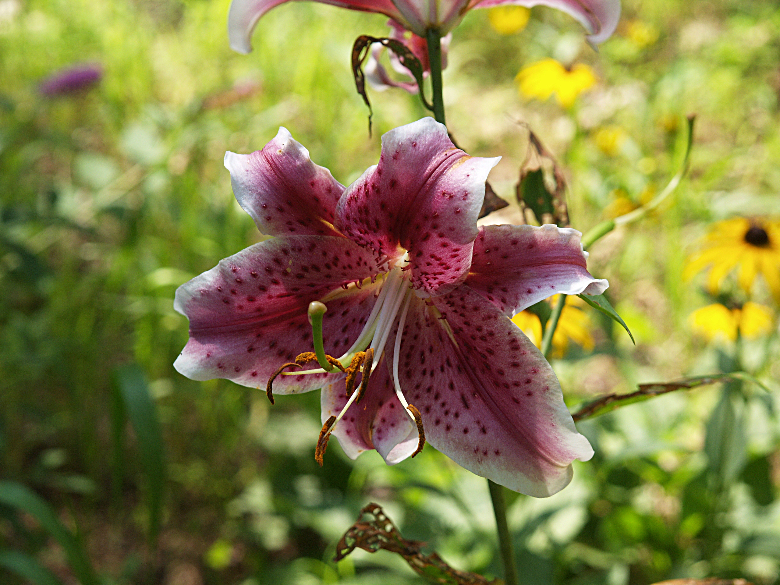 Picture #3: Purple lily Small: 800x623, 91,772 bytes (90K), (html file) Large: 2048x1536, 1,403,148 bytes (1.3M), (html file) Copyright, Michael Meissner 2006, All rights reserved Canon S1 camera f/3.2, ISO 50, 1/60 sec, 12.7mm, Superfine, center weight metering, image stabilization 35mm equivalent focal length 83.0mm Taken by Michael Meissner on July 16, 2006 17:28:01 Last modified on July 16, 2006 at 19:57 |