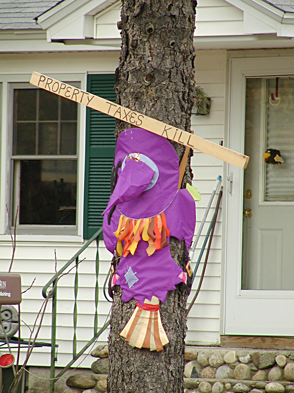 Picture #3: Property taxes kill Small: 600x823, 114,129 bytes (112K), (html file) Large: 1200x1600, 2,066,743 bytes (2.0M), (html file) Copyright, Michael Meissner 2006, All rights reserved Olympus C-2100UZ camera f/3.5, ISO 100, 1/250 sec, 65.2mm, auto mode, SHQ, cloudy, matrix metering, bias 0.3 35mm equivalent focal length 362.0mm Taken by Michael Meissner on October 31, 2006 11:51:53 Last modified on October 31, 2006 at 21:37 Shutter speed of 1/125 or 1/250 may indicate use of flash |