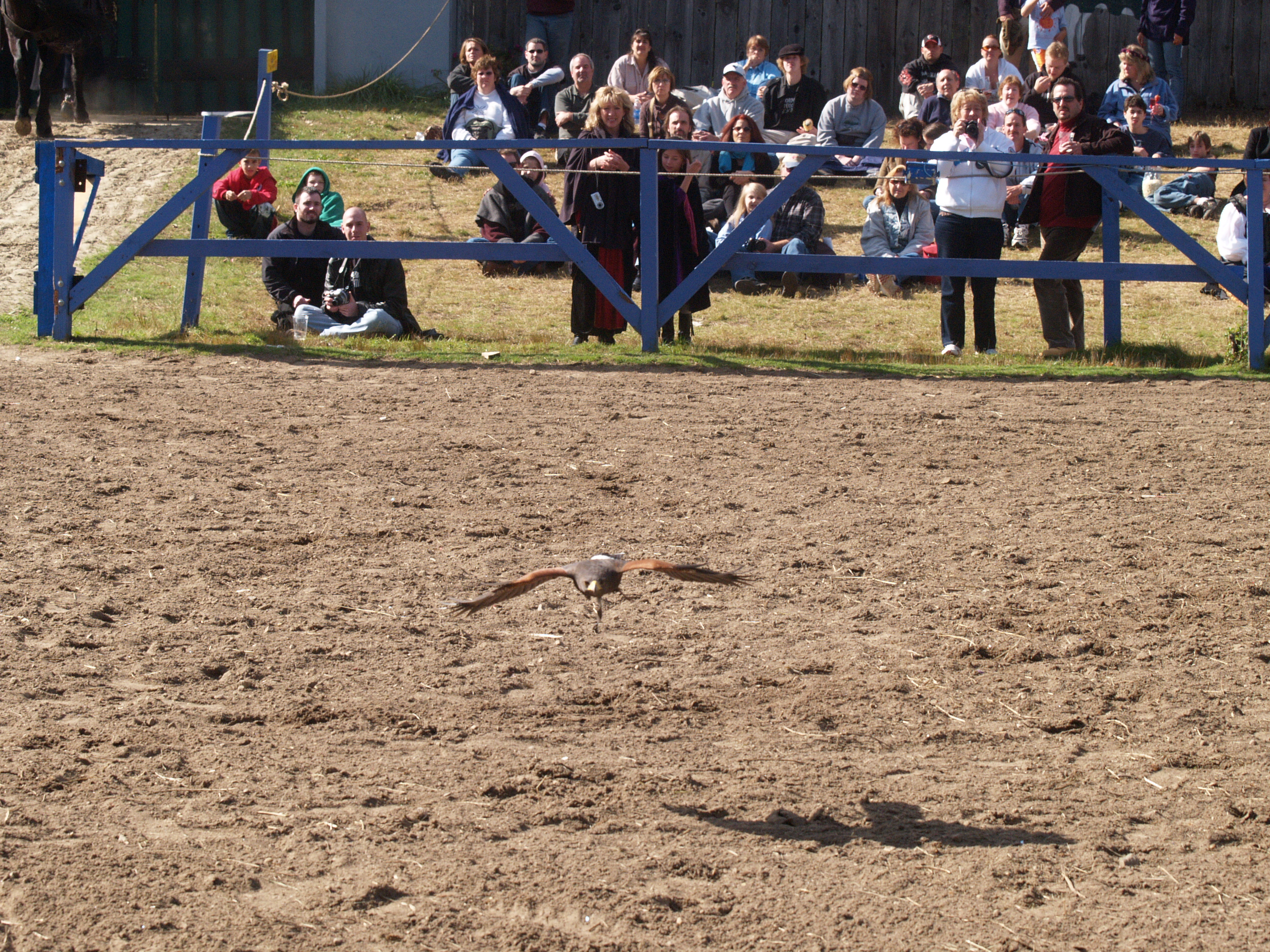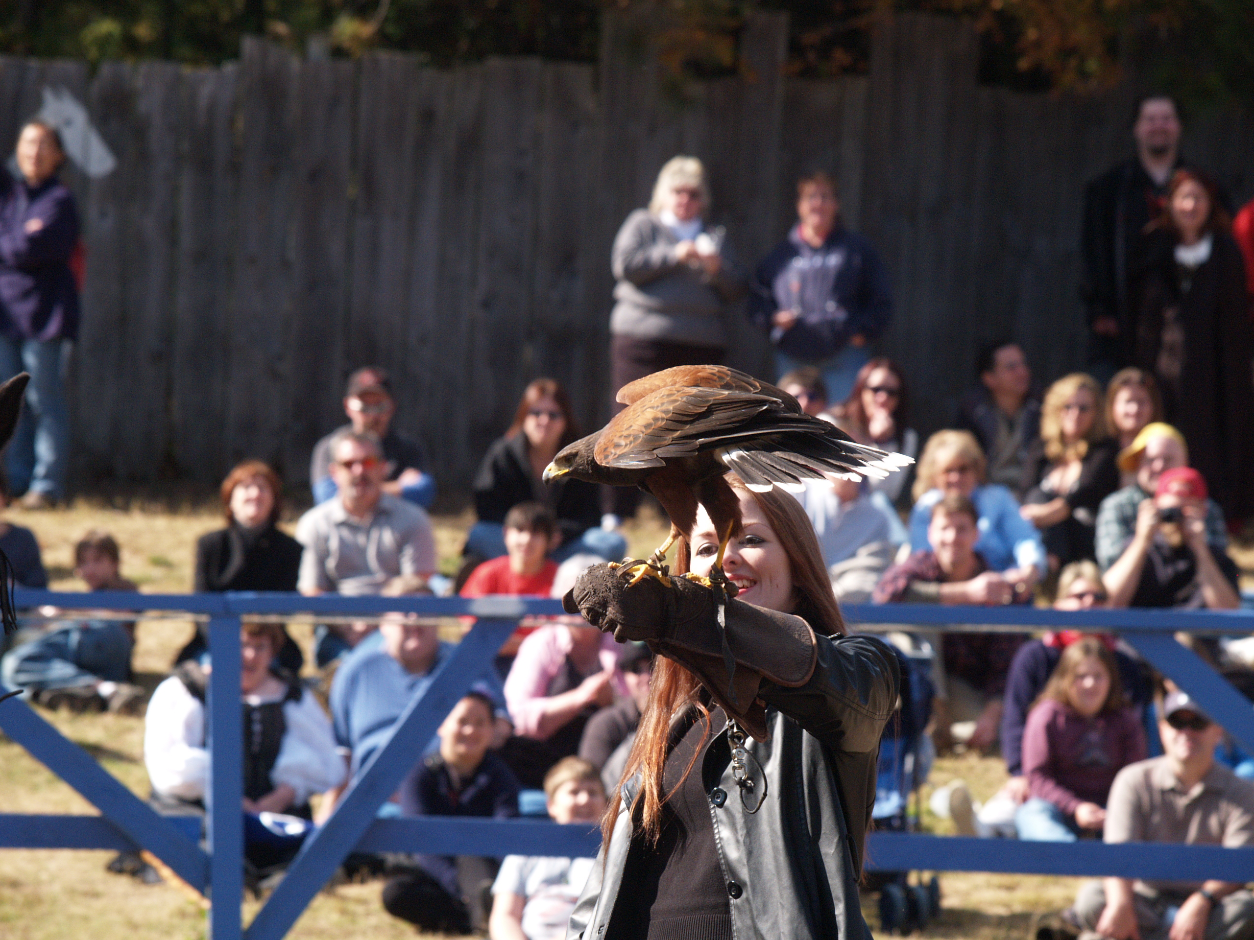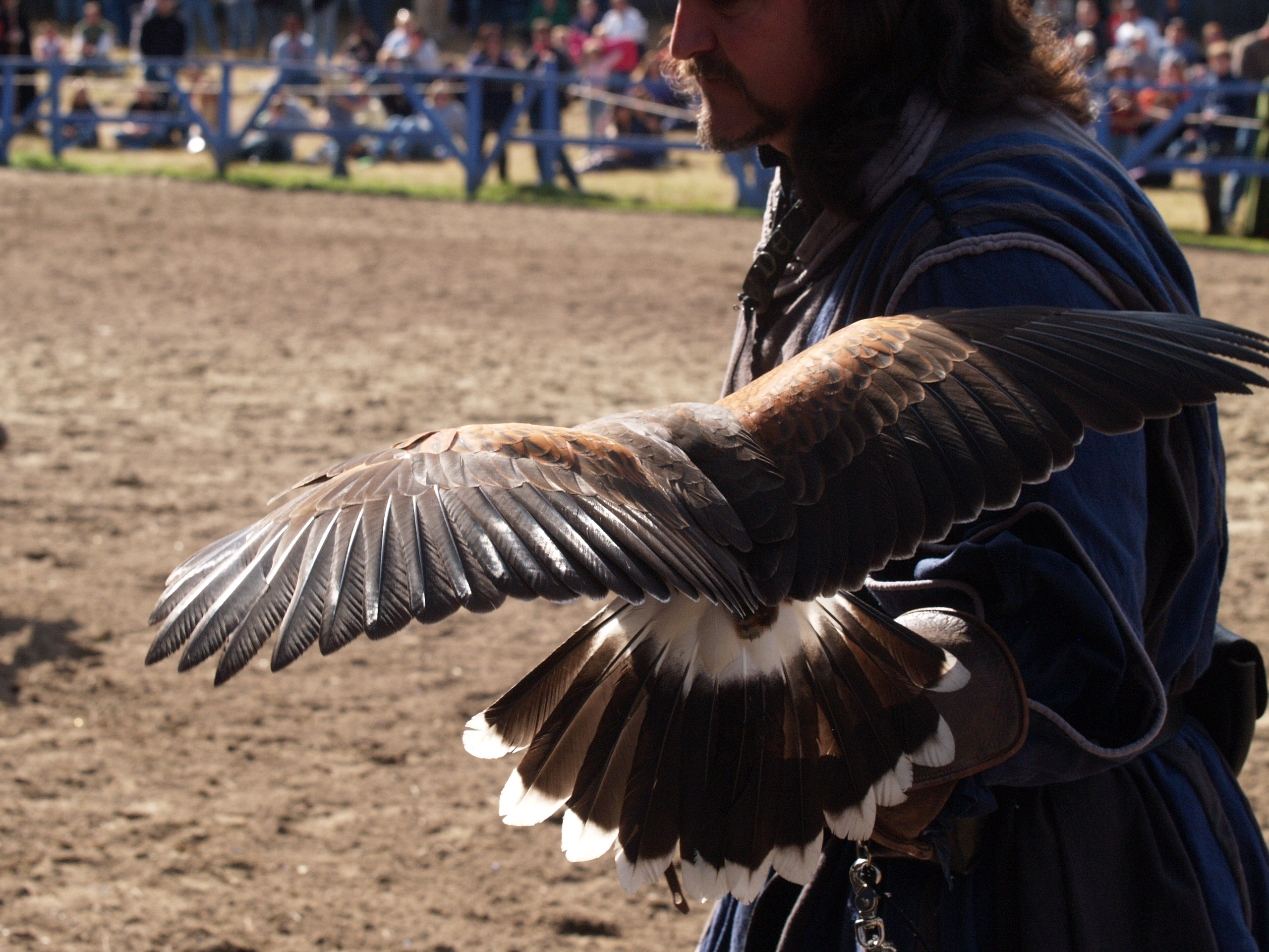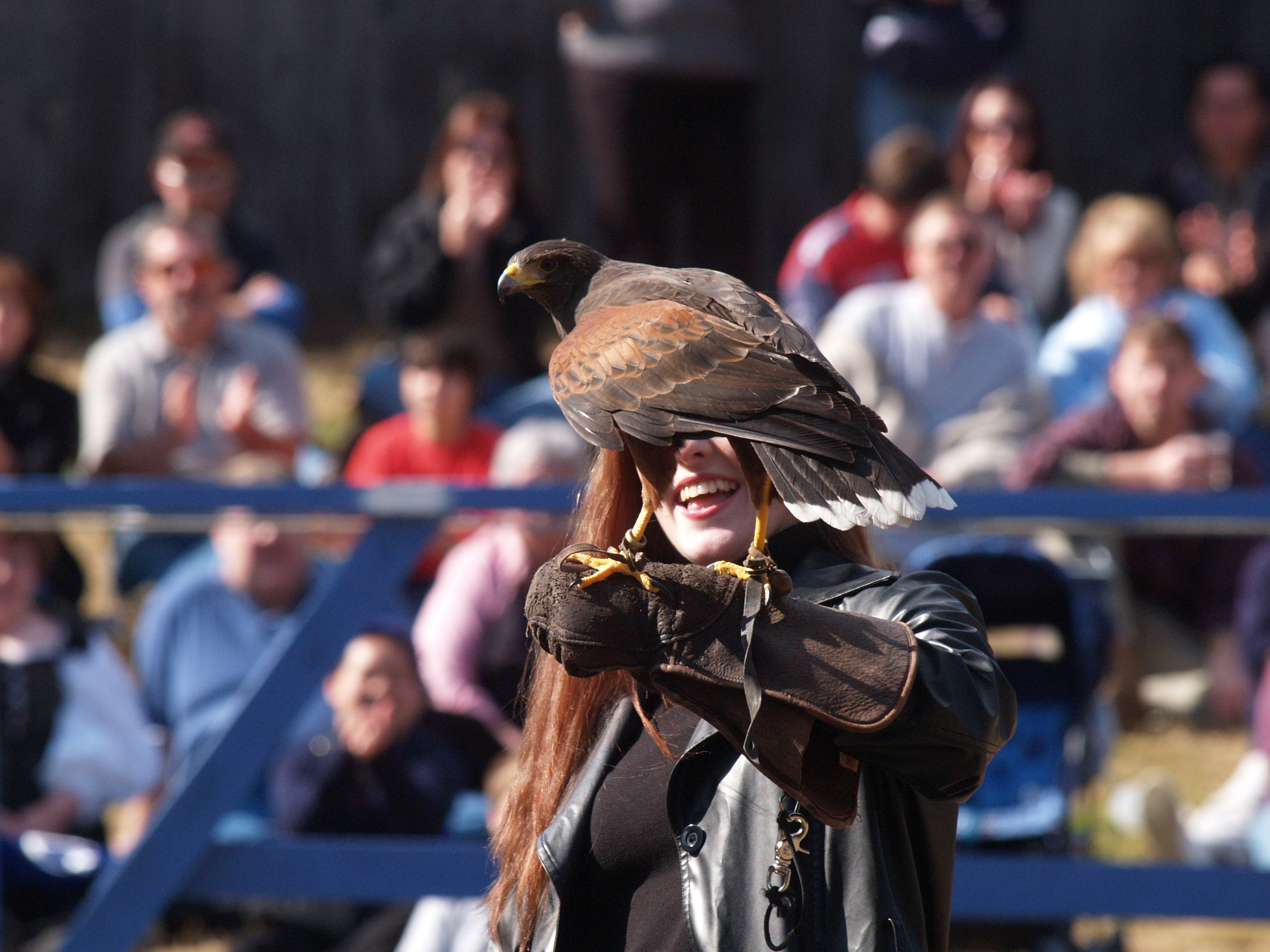 Picture #9: Knighthawk falcon show #9 Thumb: 320x240, 29,869 bytes (30K) Small: 640x503, 68,875 bytes (68K), (html file) Large: 2560x1920, 3,446,235 bytes (3.3M), (html file) Copyright, Michael Meissner 2006, All rights reserved Olympus E-1 camera with Olympus 50-200mm f/2.8-3.5 lens f/5.6, ISO 400, 1/800 sec, 130.0mm, auto mode, SHQ, matrix metering, +2 sharpening 35mm equivalent focal length 260.0mm Taken by Michael Meissner on October 14, 2006 13:43:06 Last modified on October 14, 2006 at 21:53 |