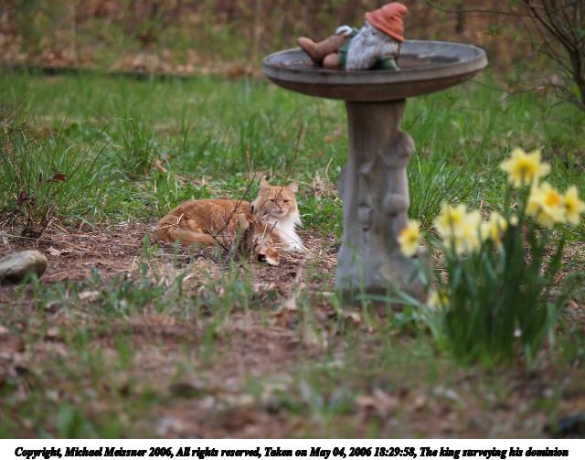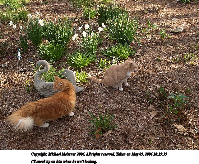 Picture #115: I'll sneak up on him when he isn't looking. 640x526, 153,811 bytes (151K), (html file) Copyright, Michael Meissner 2006, All rights reserved Olympus E-1 camera with Olympus 14-54mm f/2.8-3.5 lens f/5.0, ISO 200, 1/125 sec, 17.0mm, auto mode, SHQ, matrix metering, +2 sharpening 35mm equivalent focal length 34.0mm Taken by Michael Meissner on May 05, 2006 18:19:35 Last modified on May 06, 2006 at 09:34 |