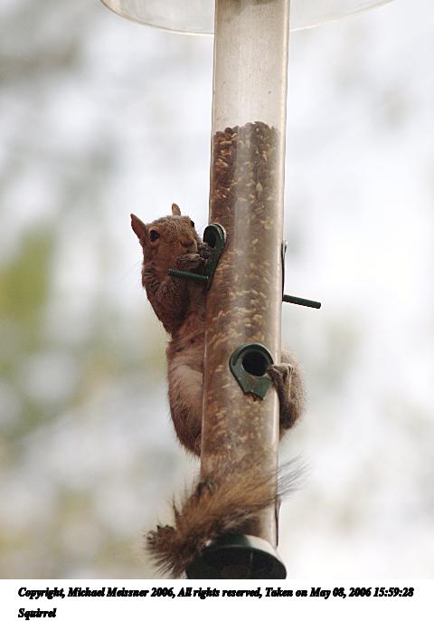 Picture #50: Squirrel #4 800x623, 78,093 bytes (77K), (html file) Copyright, Michael Meissner 2006, All rights reserved Olympus C-2100UZ camera f/3.2, ISO 100, 1/200 sec, 54.0mm, auto mode, SHQ, cloudy, matrix metering 35mm equivalent focal length 300.0mm Taken by Michael Meissner on May 19, 2006 14:22:46 Last modified on May 19, 2006 at 14:26 |