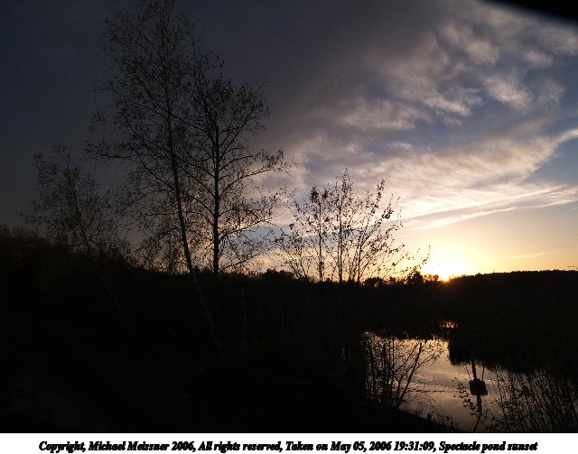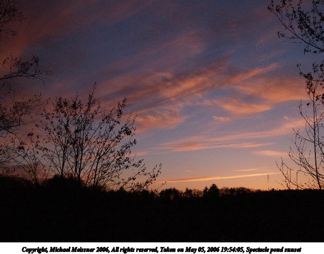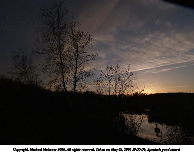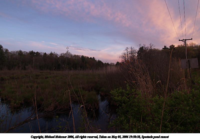Picture #82: Spectacle pond sunset #6 640x503, 57,152 bytes (56K), (html file) Copyright, Michael Meissner 2006, All rights reserved Olympus E-1 camera with Olympus 11-22mm f/2.8-3.5 lens f/8.0, ISO 400, 1/250 sec, 22.0mm, auto mode, SHQ, spot metering, +2 sharpening, Exposure bracketing (shot 1) 35mm equivalent focal length 44.0mm Extra equipment used: monopod, rm-cb1 Taken by Michael Meissner on May 05, 2006 19:54:05 Last modified on May 14, 2006 at 23:11 This picture is one of my favorites. |