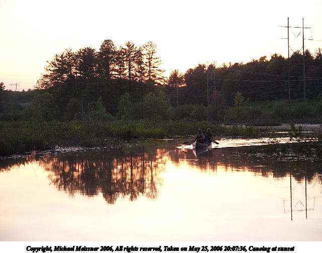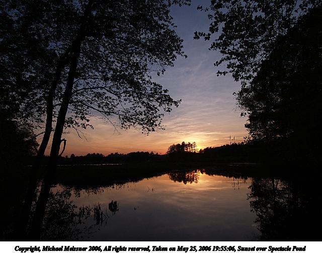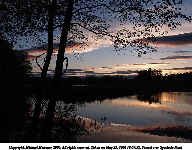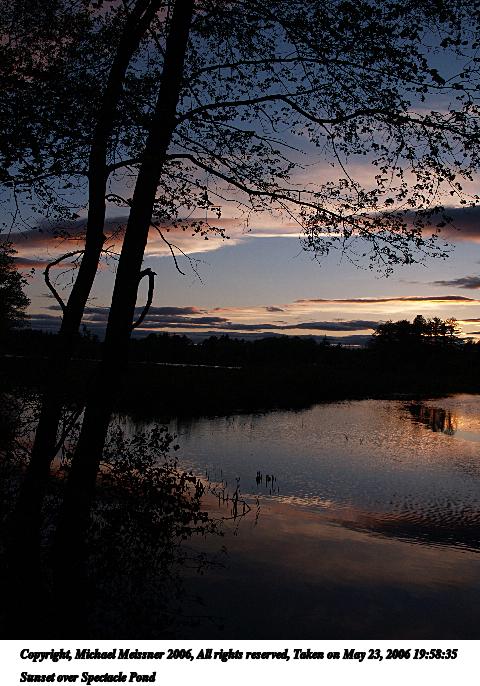 Picture #36: Sunset over Spectacle Pond 640x503, 93,941 bytes (92K), (html file) Copyright, Michael Meissner 2006, All rights reserved Olympus E-1 camera with Olympus 14-54mm f/2.8-3.5 lens f/8.0, ISO 100, 1/250 sec, 14.0mm, auto mode, SHQ, spot metering, +2 sharpening, Exposure bracketing (shot 1) 35mm equivalent focal length 28.0mm Extra equipment used: monopod Taken by Michael Meissner on May 23, 2006 19:51:36 Last modified on May 23, 2006 at 21:18 This picture is one of my favorites. |