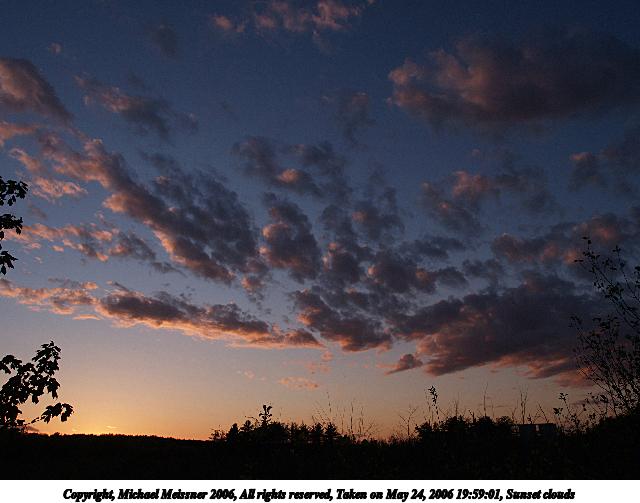 Picture #28: Sunset clouds #3 640x503, 70,877 bytes (70K), (html file) Copyright, Michael Meissner 2006, All rights reserved Olympus E-1 camera with Olympus 11-22mm f/2.8-3.5 lens f/5.6, ISO 100, 1/160 sec, 11.0mm, auto mode, SHQ, spot metering, +2 sharpening, Exposure bracketing (shot 1) 35mm equivalent focal length 22.0mm Taken by Michael Meissner on May 24, 2006 20:02:33 Last modified on May 24, 2006 at 20:45 This picture is one of my favorites. |