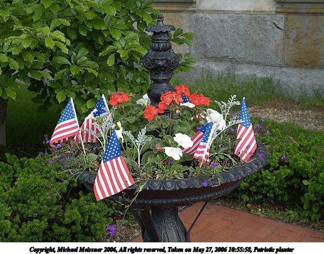 Picture #4: Patriotic planter 640x503, 100,929 bytes (99K), (html file) Copyright, Michael Meissner 2006, All rights reserved Olympus E-1 camera with Olympus 14-54mm f/2.8-3.5 lens f/4.5, ISO 100, 1/160 sec, 31.0mm, auto mode, SHQ, matrix metering, +2 sharpening 35mm equivalent focal length 62.0mm Extra equipment used: polarizer Taken by Michael Meissner on May 27, 2006 10:55:58 Last modified on May 27, 2006 at 14:04 |
