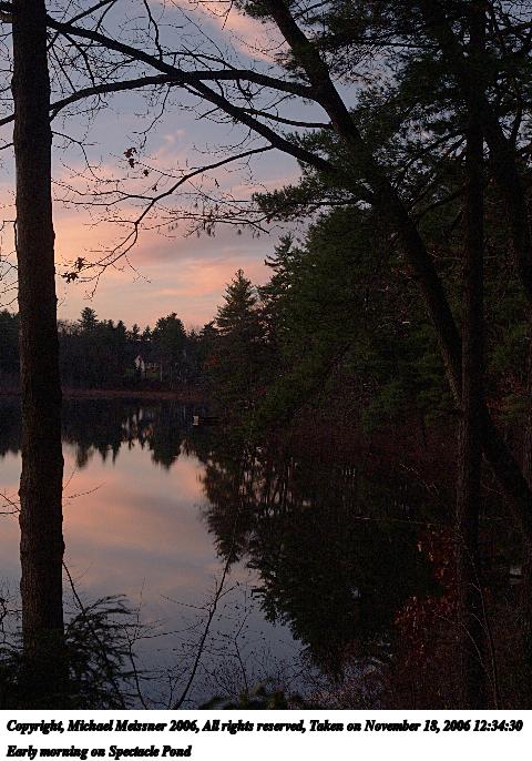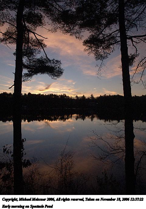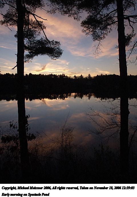 Picture #3: Early morning on Spectacle Pond #3 480x686, 78,143 bytes (77K), (html file) Copyright, Michael Meissner 2006, All rights reserved Olympus E-1 camera with Olympus 14-54mm f/2.8-3.5 lens f/7.1, ISO 200, 1/250 sec, 14.0mm, auto mode, SHQ, center weight metering, +2 sharpening, Exposure bracketing (shot 1) 35mm equivalent focal length 28.0mm Taken by Michael Meissner on November 18, 2006 12:37:22 Last modified on November 18, 2006 at 07:22 |