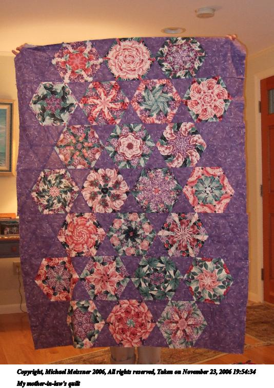 Picture #1: My mother-in-law's quilt 534x758, 99,097 bytes (97K), (html file) Copyright, Michael Meissner 2006, All rights reserved Fujifilm F30 f/3.4, ISO 800, flash, 1/60 sec, 12.2mm, auto mode, auto color, FINE, matrix metering 35mm equivalent focal length 55.0mm Taken by Michael Meissner on November 23, 2006 19:54:34 Last modified on November 23, 2006 at 17:52 |