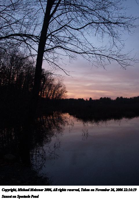 Picture #2: Sunset on Spectacle Pond #2 480x686, 74,765 bytes (74K), (html file) Copyright, Michael Meissner 2006, All rights reserved Olympus E-1 camera with Olympus 14-54mm f/2.8-3.5 lens f/5.0, ISO 400, 1/125 sec, 19.0mm, auto mode, SHQ, matrix metering, +2 sharpening, Exposure bracketing (shot 1) 35mm equivalent focal length 38.0mm Taken by Michael Meissner on November 26, 2006 22:15:26 Last modified on November 26, 2006 at 17:06 |