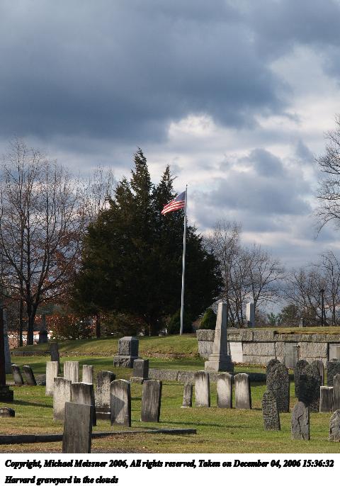 Picture #70: Harvard graveyard in the clouds 640x503, 68,586 bytes (67K), (html file) Copyright, Michael Meissner 2006, All rights reserved Olympus E-1 camera with Olympus 14-54mm f/2.8-3.5 lens f/7.1, ISO 100, 1/320 sec, 19.0mm, auto mode, SHQ, matrix metering, +2 sharpening, Exposure bracketing (shot 1) 35mm equivalent focal length 38.0mm Taken by Michael Meissner on December 04, 2006 15:35:10 Last modified on December 04, 2006 at 23:17 |