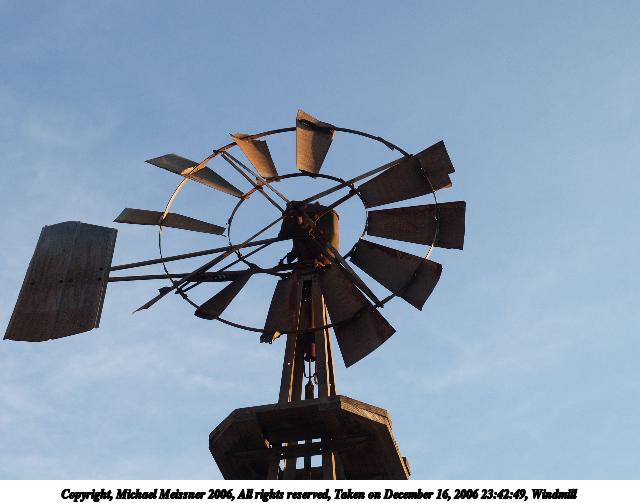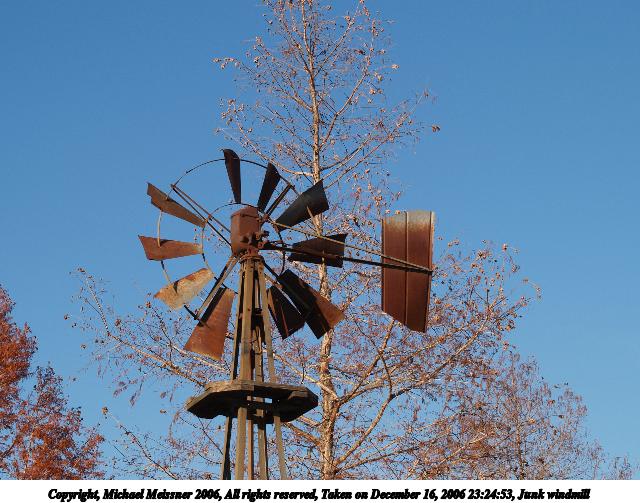 Picture #34: Junk windmill 640x503, 79,488 bytes (78K), (html file) Copyright, Michael Meissner 2006, All rights reserved Olympus E-1 camera with Olympus 50-200mm f/2.8-3.5 lens f/5.0, ISO 100, 1/400 sec, 50.0mm, auto mode, SHQ, matrix metering, +2 sharpening 35mm equivalent focal length 100.0mm Taken by Michael Meissner on December 16, 2006 23:24:53 Last modified on December 18, 2006 at 06:50 |