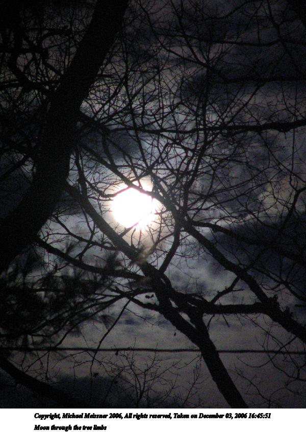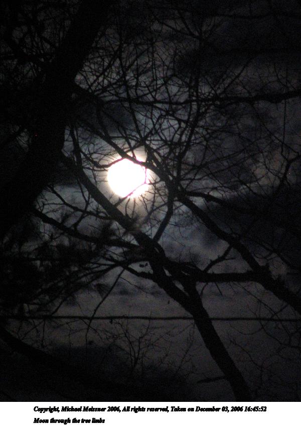Picture #50: Moon through the tree limbs #2 600x846, 70,551 bytes (69K), (html file) Copyright, Michael Meissner 2006, All rights reserved Canon S1 camera f/3.5, ISO 400, 1/30 sec, 58.0mm, Superfine, Evaluative, bias -1.0, image stabilization 35mm equivalent focal length 380.0mm Taken by Michael Meissner on December 03, 2006 16:45:52 Last modified on December 03, 2006 at 17:25 |
