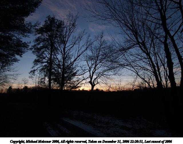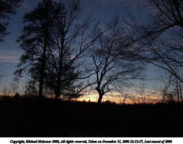 Picture #39: Last sunset of 2006 533x846, 116,095 bytes (114K), (html file) Copyright, Michael Meissner 2006, All rights reserved Olympus E-1 camera with Olympus 14-54mm f/2.8-3.5 lens f/10.0, ISO 400, 1/640 sec, 25.0mm, auto mode, SHQ, spot metering, bias -1.3, +2 sharpening, Exposure bracketing (shot 2) 35mm equivalent focal length 50.0mm Extra equipment used: tripod Taken by Michael Meissner on December 31, 2006 22:12:19 Last modified on December 31, 2006 at 23:46 |