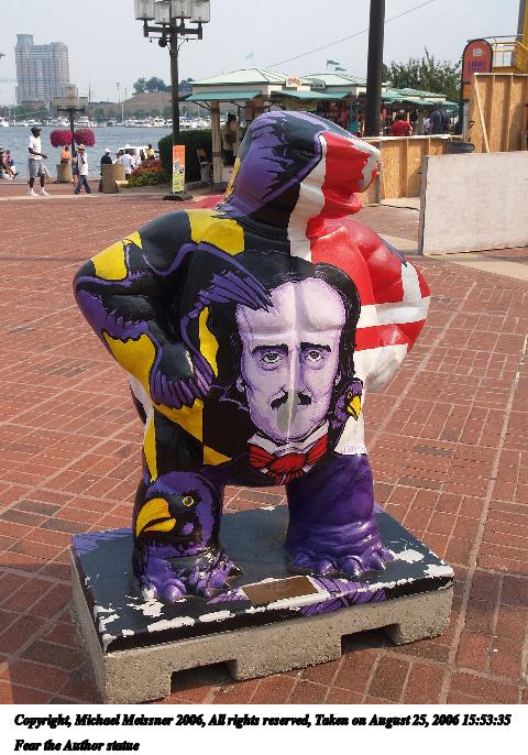 Picture #3: Fear the Author statue 480x686, 94,537 bytes (93K), (html file) Copyright, Michael Meissner 2006, All rights reserved Olympus E-1 camera with Olympus 14-54mm f/2.8-3.5 lens f/7.1, ISO 100, 1/250 sec, 20.0mm, auto mode, SHQ, matrix metering, +2 sharpening 35mm equivalent focal length 40.0mm Taken by Michael Meissner on August 25, 2006 15:53:35 Last modified on September 16, 2006 at 22:23 This is to commemorate Baltimore's favorite son, Edgar Allen Poe. |