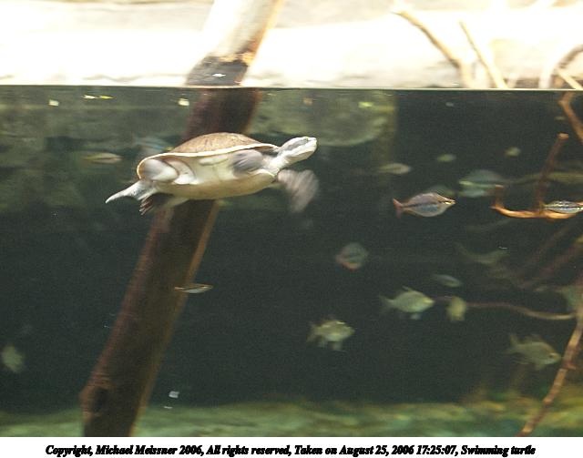 Picture #6: Swimming turtle 640x503, 44,692 bytes (44K), (html file) Copyright, Michael Meissner 2006, All rights reserved Olympus E-1 camera with Olympus 50-200mm f/2.8-3.5 lens f/2.8, ISO 400, 1/40 sec, 72.0mm, auto mode, SHQ, matrix metering, +2 sharpening 35mm equivalent focal length 144.0mm Taken by Michael Meissner on August 25, 2006 17:24:14 Last modified on August 25, 2006 at 19:15 |